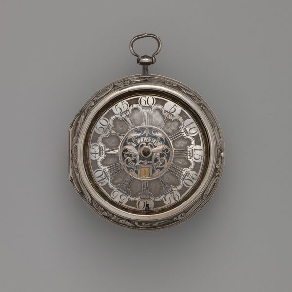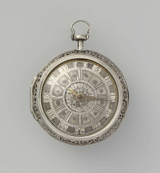 Editor: We're looking at a pocket watch with a chased depiction of two warriors in front of tents, dating to about 1740, by Hermanus Reijnders. The decorative case strikes me as the most remarkable element. What compositional elements stand out to you? Curator: The overriding principle seems to be symmetry, does it not? The face is radially symmetrical, obviously. But the eye is drawn outward towards that case where those opposed figural elements and repeating motifs vie for your attention. What principle underlies *that* composition, do you think? Editor: I notice the swirling, almost floral details along the edges contrasting with the militaristic scene on the back, maybe an opposition between peace and conflict? Curator: Perhaps. Note how the form of the watch itself—that circular form— mediates between those extremes. Consider how the very materials—metal, glass—interact. The reflections, the textures...do they not contribute to a cohesive whole? Editor: They do. Now that you mention it, there's also a subtle visual tension between the highly ornate detailing and the practical function of telling time. It's not just about ornamentation; it integrates function and form so completely. Curator: Precisely. Function dictates form but is, in turn, elaborated by aesthetic considerations. And what of time? Does not the face *itself* perform a function, yet simultaneously participate in the artistic endeavor through line, numeral, and subtle gradations? Editor: I see how the artistry isn’t just applied; it’s integral to the object's being. Curator: Exactly! A masterful interplay. Editor: I hadn’t considered the balance between form and function so deeply. It’s fascinating to see how intertwined they are in this piece.