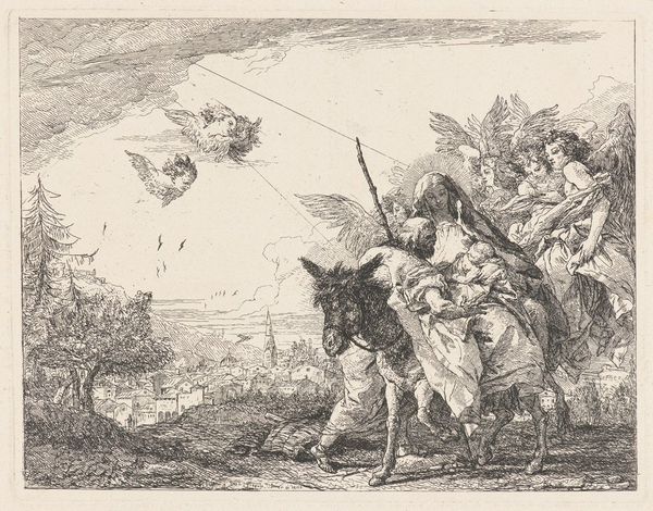 Editor: This pen sketch by Giovanni Domenico Tiepolo, dating back to the mid-18th century, is called "The Flight, Joseph at Right and Mary and Angel at Left". I find the frantic, almost chaotic energy in the linework really compelling. What stands out to you about it? Curator: It's interesting you pick up on the energy. I think that chaos reflects the real human drama amidst the divine subject. See how Tiepolo doesn't present the Holy Family in serene detachment? Instead, there's a tangible sense of urgency in their escape, a flight, yes, but also a *scamper*. Even the landscape feels restless, doesn't it? What do you make of the composition – that division between right and left, Joseph versus Mary and the Angel? Editor: Well, Joseph is very weighed down on the right side. With someone on his back, he seems far less ethereal than Mary and the angel, more of this world? Curator: Exactly! There's a very earthy quality about Joseph, and that weight on his back certainly emphasizes his burden—the need to provide, to protect. Tiepolo is brilliant at showing us not just a religious icon, but a family, burdened and in motion. And the angel, gesturing protectively? That Baroque flourish in the wings. This isn’t just a depiction of the flight to Egypt; it's a contemplation on responsibility and faith. Makes you wonder, doesn’t it? Editor: I agree, and I see all this now in that original hectic linework. He conveys so much in what might appear to be a relatively quick sketch. Curator: And that immediacy adds to its power, doesn't it? Art isn’t just about flawless execution, but about capturing a feeling, a fleeting moment of human truth. Tiepolo grabs it, rough edges and all, and throws it onto the page for us to grapple with. I think I learned something too!