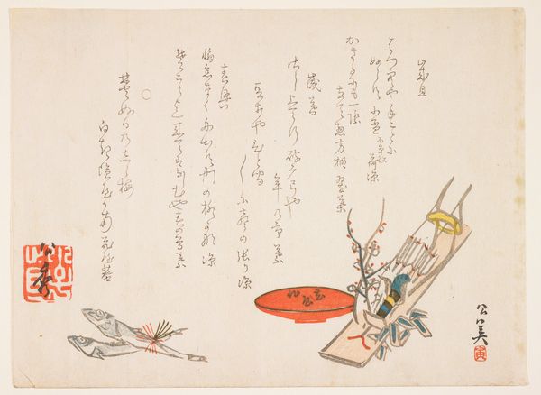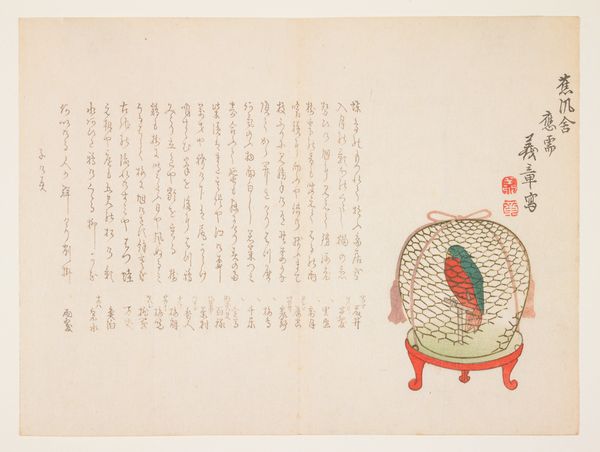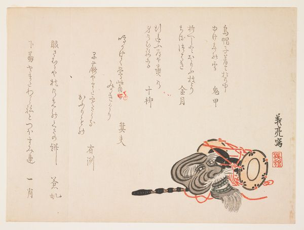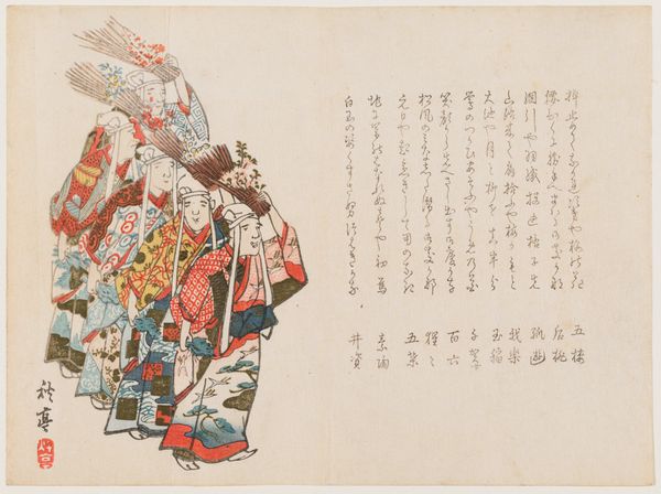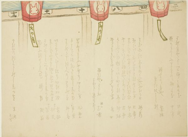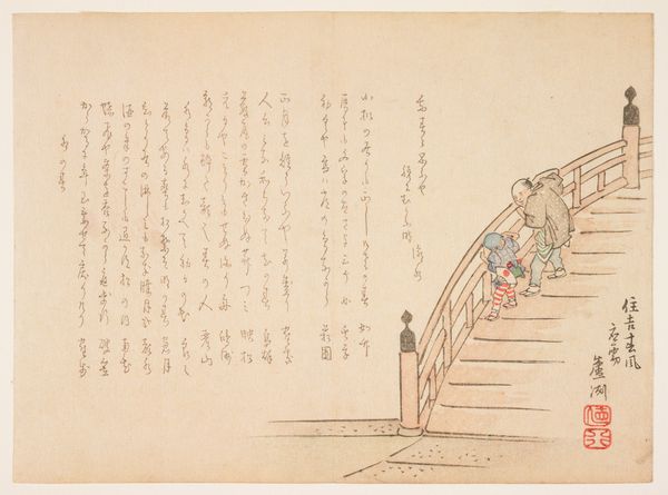 Curator: Allow me to introduce you to a woodblock print by Matsukawa Ryūchin, titled '(Shrine festival dancer)', created around 1840. It’s currently part of the Minneapolis Institute of Art collection. Editor: There’s such quiet wistfulness about it. The red bridge pops out, yet all the action is unseen, implied. She's a dancer on pause, with her back to us, facing what? Anticipation hanging in the air. Curator: Indeed. Consider the composition. The figure occupies the lower right quadrant, balanced by the calligraphy filling much of the upper space. The bridge, a horizontal thrust of vermilion, leads our eye but ultimately deflects it back to the woman’s form. Editor: That calligraphy. It’s like a swirling wind pushing against her. I wonder what stories those symbols tell? And the dancer, her kimono is muted but detailed... almost whispering secrets. Is it joy she expects or a solemn ritual? I find myself longing for colour, even though this restraint is rather striking. Curator: The subtlety in palette underscores the piece's formal qualities. The artist focuses on line and form; notice the meticulous detail in the woman's coiffure and the elegant curve of her garment, all achieved through the woodblock technique. Semiotically, the text might serve as a key that unlocks the meaning. The narrative suggests the larger story around festival celebration. Editor: I can almost smell the incense and hear the faint music carried on the breeze. But there’s something melancholic. A lone figure… Does she reflect the ephemeral nature of performance? Curator: Ukiyo-e often engages with themes of transience and beauty. Perhaps it's a commentary on the fleeting nature of a dancer’s performance. The woodblock's creation freezes a transient instant. Editor: Hmm. I was completely absorbed by her emotional state… Curator: And quite rightly so, art can be approached via both emotional connection and formal analysis. Editor: Absolutely, but that human element is just, you know…vital. Alright, then. Dance on! Curator: A fitting summation. Thank you.