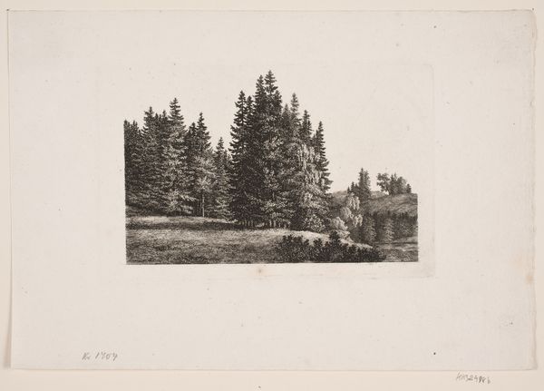 Curator: Looking at this piece, I’m immediately transported to a hushed, contemplative space. It's delicate, but somehow also monumental. What’s your initial reaction? Editor: Monumental is right. These pines are old souls, silent witnesses to history. It feels both peaceful and slightly… melancholy, like a fading photograph of a beloved place. Curator: It's fascinating how such subtle realism can evoke such a strong emotional response. The drawing is entitled "Landscape with Pine Trees", by Barend Cornelis Koekkoek, dating back to 1829 or 1830. The medium is deceptively simple: pencil on paper. Yet, the impact is profound. Editor: Pencil! Seriously? It looks like an etching almost, with all that delicate detail. Look at the textures he's achieved. The way the light falls… You can almost feel the coolness of the air under the pines. How did someone get this feeling with simple pencil strokes? Curator: Well, the artist had the cultural movements of Realism and Romanticism feeding his choices and process, two significant styles, particularly in landscapes such as this. Each tree could be a symbolic totem, with an evocation of timeless strength. Their arrangement suggests an intuitive design, leading our eye deeper into the pictorial plane. Editor: Exactly! It’s not just *any* forest; it’s *this* forest, pregnant with unspoken stories and secrets. We all have our forest spaces, whether or not we’ve touched them in person. I wonder about its significance for the artist. Maybe an escape from urbanization or a place for personal, introspective communion? Curator: Indeed, perhaps reflecting humanity's relationship with the natural world through this tranquil visual arrangement. What I find most interesting is its realism being almost dream-like. Editor: Yes, a tangible dream, almost. Like remembering a specific morning in immense detail and then being uncertain of which details were true. This quiet little pencil drawing whispers volumes about how our memories are woven with landscapes and our subjective projections upon them. I have to sit with this a while longer!