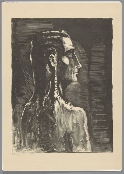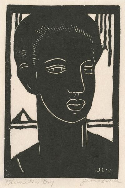 Curator: Before us is Samuel Jessurun de Mesquita’s “Portret van een onbekende man,” a woodcut created in 1927 and held at the Rijksmuseum. What’s your first reaction to it? Editor: Stark. The high contrast creates a sense of unease, almost confrontational. The simplified forms give the portrait a raw, unsettling quality. There's an intensity radiating from this image, built from a complex matrix of intersecting lines. Curator: Yes, and consider the context of the woodcut itself. As a medium, it possesses a graphic quality capable of portraying potent expression. De Mesquita used this technique, the sharp contrast of the linework, to embody a certain expressionist ethos common at the time. Note how the image feels both representational and stylized, creating distance and abstraction in the portrayal of the individual. Editor: Absolutely. And how those graphic, expressive lines create a background seemingly pulled from cubism, isolating the man’s head. Almost halo-like. I keep being drawn back to the lines around his face and neck. It’s both anatomical and jarringly abstract. A potent distillation down to the graphic. Curator: It resonates, doesn't it? He uses geometry to depict emotion, translating internal psychological realities into external visual form. The repetitive horizontal and vertical strokes used to represent the neck call to mind ritualistic scarification practices from several cultures, perhaps suggesting underlying cultural or spiritual beliefs of the sitter. The face itself evokes the symbolism of masks – protection and concealment, especially regarding the unreadability within the subject’s intense gaze. Editor: An intriguing suggestion, thinking of masks, considering also how Expressionism tried to lay bare the psychological torment lurking beneath bourgeois order. By reducing form, the artist aims to enhance emotional presence. This stripping bare speaks powerfully about its era, the tensions between societal presentation and individual experiences. Curator: It certainly does. This man’s essence remains an enigma, even while presented so starkly. Editor: A very fruitful tension. I leave this portrait with even more to consider.