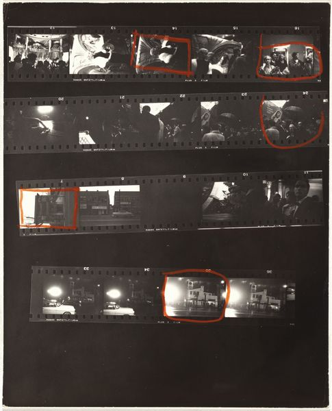 This is Robert Frank’s "Guggenheim 71/Detroit 7," a collage of photographs. It feels like a raw, immediate process, like a painter’s working study. There’s a real tactile quality to this piece. Frank isn’t trying to hide the seams, or the edges of the film, in fact the black plastic dividers between the images are integral to the composition. There are even marks in red grease pencil that look like the artist's edits, showing us how he's looking and thinking. My eye is drawn to the contrast between the bright, almost exploding, cityscapes with their twinkling lights and the darker interior spaces with people playing pinball. The city scenes are full of movement, while the pinball shots focus on static figures. There’s a beautiful relationship between the rhythm of the individual images and the whole piece. Frank's work is an important influence on so many artists working today and remains a reminder that photography is about seeing, feeling, and assembling fragments to try and capture a sense of the world around us.