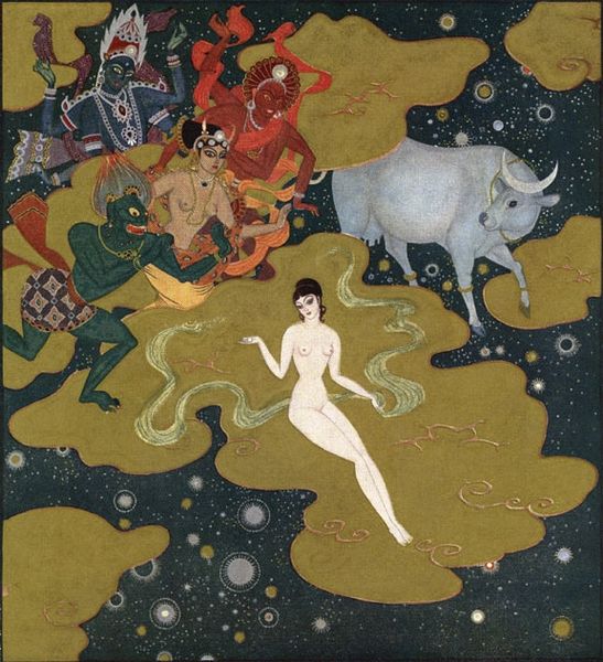Edmund Dulac crafted "The Pearl of Love" as an illustration, rich in symbolism. Notice the deer in the background, traditionally symbols of gentleness, love, and grace, often linked to the divine feminine. These creatures, with their delicate presence, echo through art history, reminding us of the sacred groves of Diana in classical art, where the deer symbolized purity and connection to the natural world. In Dulac's scene, the deer, coupled with the intimate posture of the lovers, evokes a powerful emotional resonance, tapping into our collective memory of idealized love and harmony with nature. It is like an ancient echo, felt in our souls. This image resonates with a deep psychological connection, engaging us on a subconscious level through its symbols of innocence, love, and the eternal dance between humanity and the natural world.