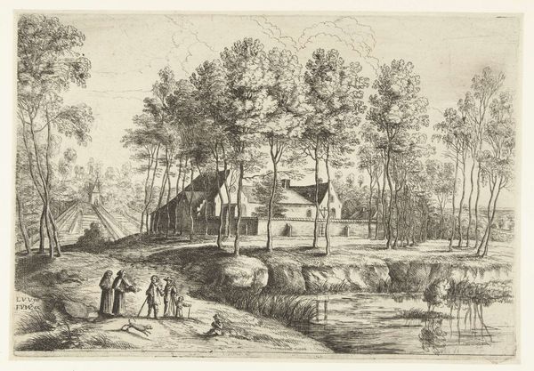Curator: The Harvard Art Museums hold this small etching, simply titled "Landscape" by an anonymous artist. It measures only 8 by 16 centimeters. Editor: It has a kind of serene, almost fairytale quality to it, wouldn't you say? The way the church sits atop that rise, framed by the trees… Curator: Indeed. Notice how the artist uses the church as a focal point, placing it centrally, while the gathering on the rise suggests a communal or perhaps a ritualistic significance? Editor: The steps leading up, they seem to invite the viewer into this special space. It's a pilgrimage, maybe? And the figures, gesturing… are they directing us, or each other? Curator: Perhaps they are marking a transition, a shift in social space demarcated by the church itself, whose elevated position would have reinforced its authority within that setting. Editor: It’s a captivating scene. I find myself drawn to the symbolism of nature enveloping this sanctuary. There is a kind of grounding in faith. Curator: I agree, and observing it through the lens of history helps us grasp how landscapes like these often reflected the social and spiritual order of their time.