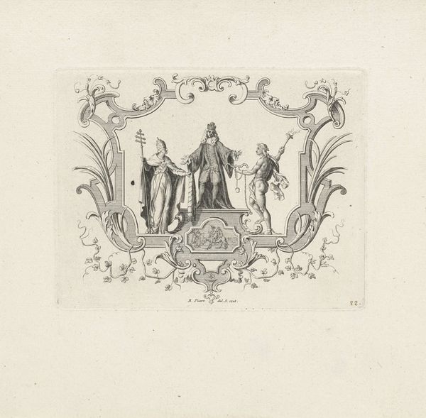 Editor: Here we have "Allegorische voorstelling met vier vrouwen in een landschap," an engraving by Gabriel Huquier, created between 1729 and 1737. It looks quite ornate, almost theatrical in its arrangement. What visual elements stand out to you in this piece? Curator: Initially, I am drawn to the composition's deliberate structure. Note the interplay between curvilinear forms—the decorative frame, the cascading foliage—and the more rigid geometric shapes found within the architectural elements. How does this contrast contribute to the overall reading of the work, would you say? Editor: Well, it creates a kind of tension, a structured freedom, perhaps? The eye is drawn to the central figures, but always within this very defined, almost artificial, space. Curator: Precisely. Examine how the varying densities of the engraving lines create depth and texture. Light and shadow aren't merely representational, but also serve to articulate form, creating a visual hierarchy. Do you notice how the foreground is much more sharply rendered than the background, creating a focal point for the figures? Editor: I do see that now. It’s almost like the figures are existing on a stage. The further back, the softer everything looks. It makes the central grouping stand out more. Curator: Exactly. It is less a naturalistic depiction and more an exploration of formal relationships within a controlled environment. It's a study of line, texture, and composition, rather than pure representation. Editor: This way of seeing the piece really changes my perspective on the artwork and reminds me of the artificiality within that period's aesthetic ideals. Thank you! Curator: My pleasure! It's in understanding the visual language that we begin to understand the work itself.