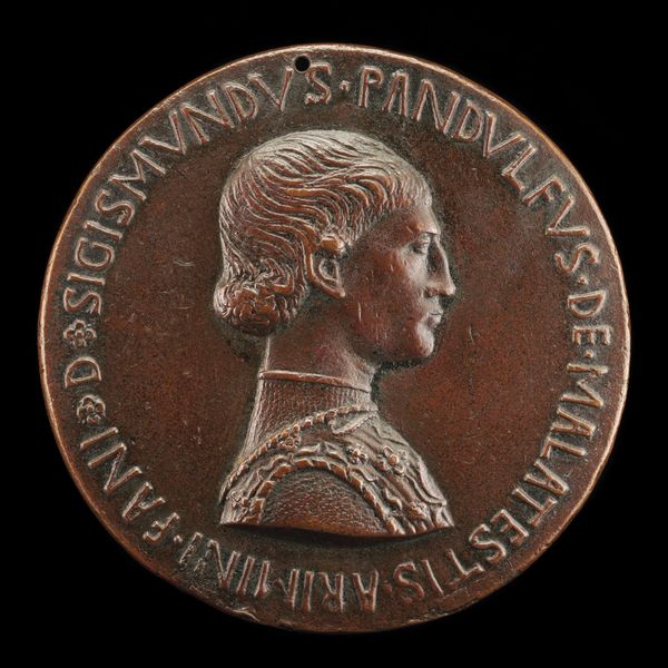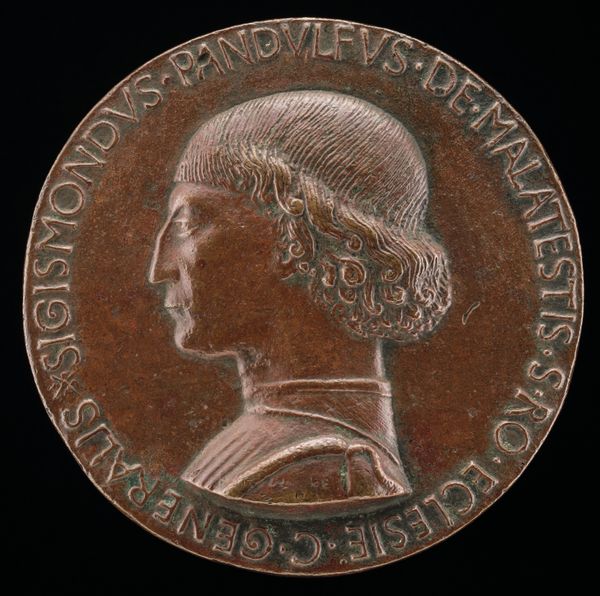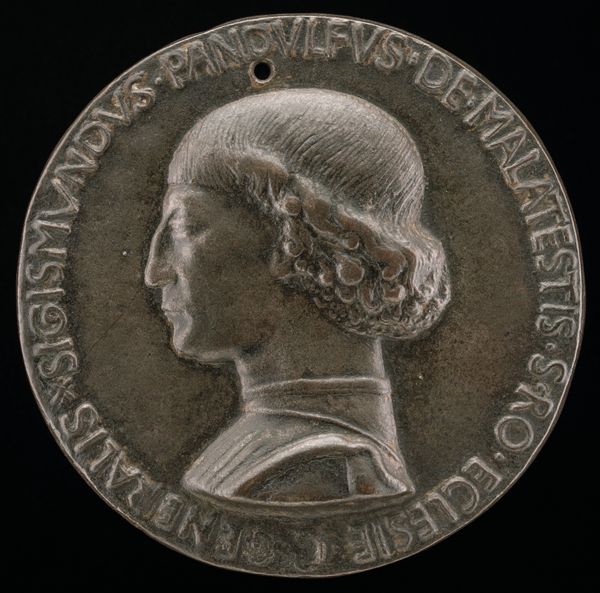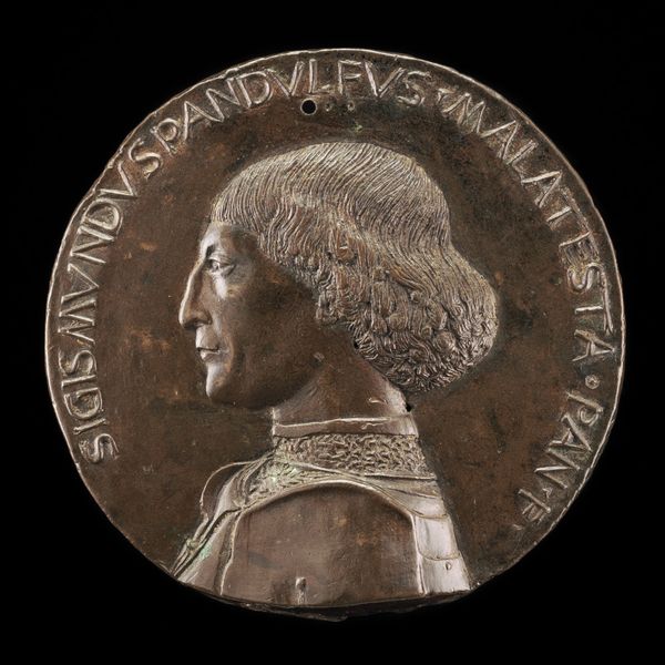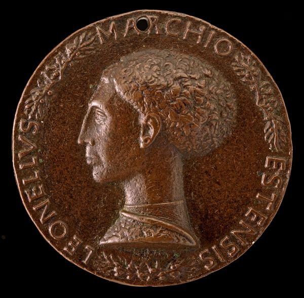 Pisanello created this bronze medal depicting Leonello d’Este, Marquess of Ferrara, during the Italian Renaissance. As a ruler, Leonello's identity was intimately tied to his status, demanding specific forms of representation. This portrait, however, transcends mere likeness; it reflects the cultural and political values of the time. The profile view, reminiscent of ancient coins, was a deliberate choice to align Leonello with the legacy of classical rulers, enhancing his authority and prestige. The inscription further solidifies his identity, carefully constructing his image. Consider how the medal itself functions as a tool for disseminating power. Intended for circulation amongst the elite, it served as a constant reminder of Leonello’s reign. Its creation speaks volumes about the power dynamics and identity construction during the Renaissance. The work also prompts us to consider the emotional weight placed upon such objects, both then and now, as symbols of legacy and power.