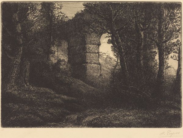 Alphonse Legros made this etching, Farm on a Hill, using a dense network of finely etched lines. Notice how the network of lines creates a range of values from light to dark, capturing the building nestled among trees and foliage. Legros uses the etching technique to give this work a structural framework. The composition is almost claustrophobic, the building nearly consumed by the surrounding landscape. The eye moves from the lower foreground, filled with dense vegetation, up to the more open, lighter sky. The form of the landscape is not clearly defined, with the building an interruption of nature. This treatment challenges traditional landscape art with its romantic portrayal of nature. Legros instead hints at humanity's uneasy relationship with the natural world. The etching's formal qualities become a powerful means of expressing the complex tension between nature and civilization.