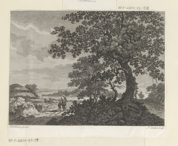 Curator: This etching, "Heuvellandschap met figuren op een landweg," which translates to "Hilly Landscape with Figures on a Country Road," was created by J.L.L.C. Zentner between 1791 and 1798. It's a fascinating example of late 18th-century Neoclassical landscape art. Editor: It feels so…contained. Everything’s neatly arranged, the light is evenly distributed, and even the rough landscape feels quite mannered. It's serene, almost staged, yet that road hints at social narratives. Who are these figures and where are they headed? Curator: The Neoclassical period embraced order and reason, often idealizing nature rather than portraying it realistically. Landscapes weren't just backgrounds, they reflected a moral order and societal structure. Genre scenes became popular during this period because artists were interested in conveying stories and commentary within these tranquil landscapes. Editor: Exactly. This piece reminds me how land ownership was depicted during this period of stark socio-economic division. It brings up important questions about representation – whose land is this really, who is granted access, and who gets to own the narrative? Curator: Those are crucial questions. Zentner's artistic choice also reveals the influence of the Picturesque movement, seeking controlled and beautiful views that often reinforced the status quo. Etchings like these were often reproduced and distributed widely, shaping public perceptions of the natural world and its place within a social context. Editor: You can really feel the hand of power at play when considering that it was distributed widely to the public. While ostensibly representing nature, it arguably shaped consent around how land was used, by those same social systems. And notice how small the figures are in comparison to the land itself! Curator: It emphasizes their humble place in the world. A key takeaway here is that we need to consider the broader impact. While Zentner crafted a visually appealing scene, we should explore how it played into the existing social fabric, particularly surrounding land usage and power distribution at the time. Editor: Absolutely. It reminds us that art is never created in a vacuum. Considering the socio-political context enables us to actively unpack these beautiful images and better understand what stories they reinforce and who may be missing from the picture.