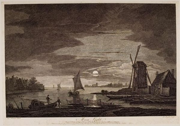 Curator: This is Franz Edmund Weirotter’s “Harbor Entrance at Sunset.” Note the artist’s dates; he lived from 1733 to 1771. Editor: It's brooding, almost gothic. The textures create a dark, romantic mood. Curator: Interesting. I see in Weirotter’s work an exploration of 18th-century anxieties. The harbor—a site of trade, travel, and exchange—is here cast in shadow, hinting at the uncertainties of global commerce and the rise of mercantile capitalism. Editor: The composition directs the eye, though. The tonal gradations and rhythmic placement of the windmills create a powerful sense of depth. Curator: Yes, and the figures in the boats, are they laborers? Refugees? Their stories are central to understanding this era. Editor: Perhaps. But the etching technique itself, the varying line weights, also builds a strong visual narrative. Curator: Perhaps both aesthetics and ethics are in play here. Editor: Indeed. A compelling interplay of light, shadow, and suggestion.