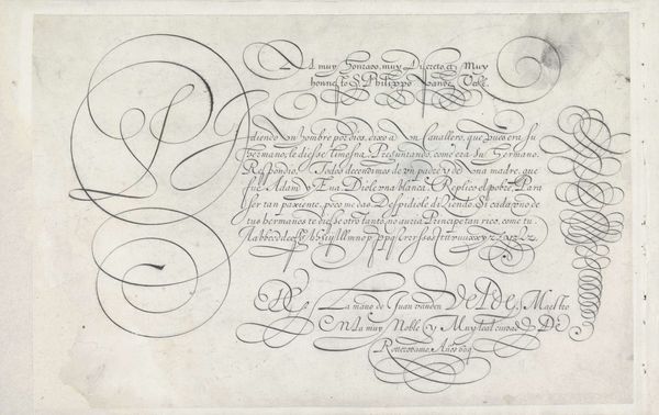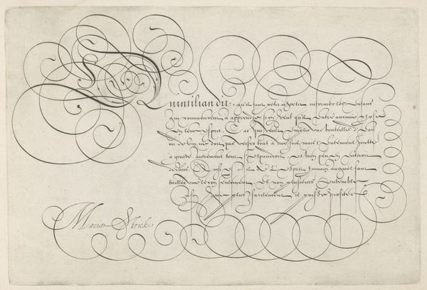 This is a writing sample with a capital M made by Hans Strick, likely in the Netherlands sometime around the late 16th century. The elegant flourishes and careful script remind us that handwriting was once considered an art form, not just a means of communication. In a time before widespread literacy, the ability to write beautifully was a sign of education and refinement, and ornamental scripts were often associated with wealth and status. Note the French text that accompanies the large M, which speaks to the influence of the French language in the Dutch Republic at the time. Who was the intended audience for this piece? Was it meant to be an example for students learning calligraphy, or a display of the artist's skill for potential patrons? As historians, we might look to archives and collections of writing manuals to understand the conventions and expectations of calligraphy in the 16th century. By studying the social and institutional context of this artwork, we can begin to appreciate the values and aspirations of the culture that produced it.