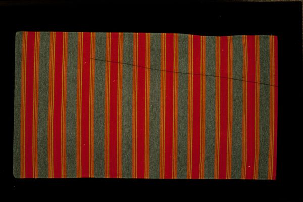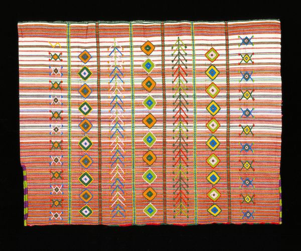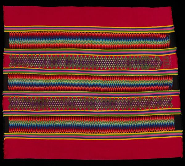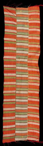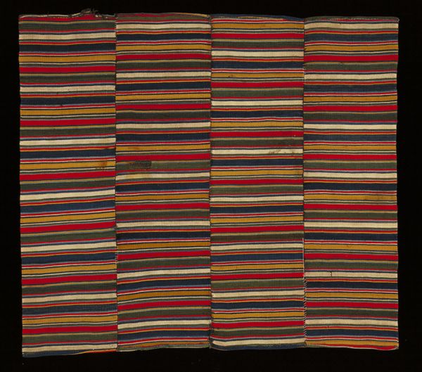 Editor: Here we have "Saint's Rebozo," a silk textile from the early 20th century. It features these beautiful, soft-colored stripes, but something about the way the weaving is structured, especially at the sides, feels so intentional. How do you interpret this work in relation to its cultural context? Curator: It's interesting you mention the weaving structure. Textiles like this rebozo were – and are – deeply embedded in the social fabric of indigenous communities in the Americas. This piece invites us to consider the politics of adornment and the power of material culture in shaping identity. Who do you think would wear it? Editor: Given the name "Saint's Rebozo," I would assume a woman deeply connected to her faith. Curator: Precisely. Clothing holds such powerful cultural weight. Its creation is part of a system, weaving traditions literally preserve and display wealth. Who is afforded the cultural currency, the honor, of being a wearer of it? This wasn't made by a machine. It was produced and disseminated among an exclusive echelon. Editor: That is fascinating. So, you are suggesting that the creation and the wearing of an item are tied to a larger system? Curator: Absolutely. This rebozo tells a story about community, status, and the role of religious practice within a social hierarchy. Its preservation in a museum setting adds another layer to its history. Editor: I see. Thinking about this object beyond just aesthetics really changes my understanding. Curator: Exactly. That's what I hope our listeners will walk away with: an enriched perspective on material culture!