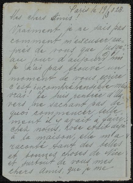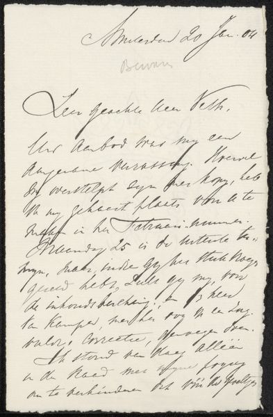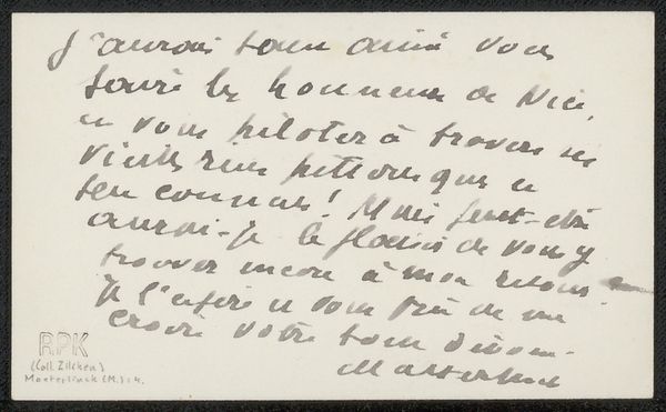 Curator: Welcome. Here we have a letter, titled "Brief aan jonkheer Hendrik Teding van Berkhout," or "Letter to Esquire Hendrik Teding van Berkhout." The work is attributed to Dolf van der Haar and thought to have been composed around 1932, created using pen and ink on paper. Editor: It feels very intimate, almost like peeking into someone's personal thoughts. The handwriting is beautiful, in its own way, even though I can’t read a word of it. There's a certain vulnerability in the handwritten form. It's like a direct line to the artist's hand, their mood at the time. Curator: Indeed. It embodies the Intimism art movement, focusing on private, domestic scenes, and personal relationships. This particular letter offers a window into van der Haar’s connection with Hendrik Teding van Berkhout. Van der Haar seems to be seeking the addressee's assessment and expresses anticipation for being in Amsterdam. Editor: You can sense that. There's anticipation and a bit of self-consciousness. The hurried scrawl feels like someone desperate to communicate something specific, almost urgently. Is that address at the top? “Middelburg, 30 Nov ‘32?” There’s such personality in it! Curator: Yes, it appears to include a date and location – Middelburg, November 30, 1932. It also demonstrates modernist stylistic qualities, rejecting traditional artistic conventions. Think about the use of handwriting as the primary form of expression and how calligraphy as visual art was explored in the early 20th century. It challenges the separation between writing and art. Editor: It makes you think about how much we’ve lost with digital communication. The nuances of ink on paper, the little imperfections—those are all part of the message. They are human. This small artwork acts as visual diary of its time. Curator: Precisely. It's an insightful demonstration into personal correspondence, reminding us of a time when such handwritten letters formed a vital connection between individuals. Editor: Yes. A peek into a moment, beautifully preserved, that speaks to how much intention we put into communicating ourselves.