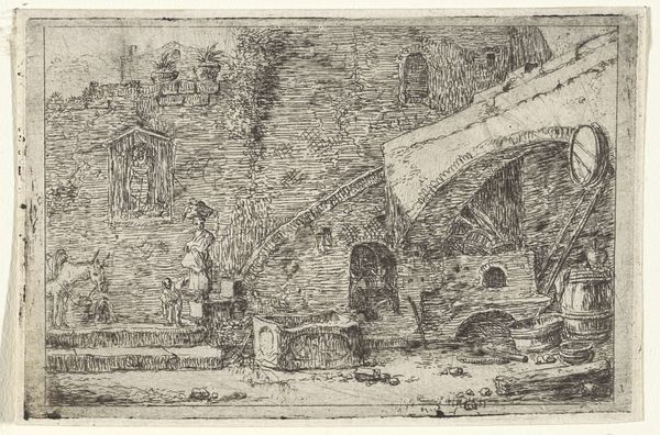 Editor: So, this etching, "Path to a Ruined Gateway" by M. Schaep, was created around 1648. The stark lines give it a kind of solemn feel, almost like a document of a bygone era. I am interested in how the technique emphasizes the crumbling facade over everything else. What are your immediate impressions when looking at this work? Curator: Immediately, the structural dichotomy is striking. Note the artist's calculated use of line weight and density. The ruined architecture dominates, built upon horizontal and vertical lines that intersect, giving it the effect of standing as both the beginning and end. How would you say the formal qualities contribute to its meaning? Editor: The intricate cross-hatching builds texture to suggest decay and perhaps instability. The stark contrast with the lighter background seems intentional, does it draw your eyes in? Curator: Precisely! That starkness creates a visual hierarchy, foregrounding ruin through varied linear densities, while simultaneously suggesting depth. Consider the geometric purity of the arch juxtaposed with the crumbling stone: It is about more than dilapidation; observe how it makes you feel and where it guides your gaze. What can we tell about space? Editor: It feels shallow; there are very few layers of depth that build any dimension or add interest. The human figures seem small, almost swallowed. Curator: Indeed. By minimizing spatial depth and diminishing the figures, Schaep forces us to contemplate the nature of the arch and the ruins. Its success hinges upon precisely calibrated lines, drawing the observer into a meditation on time and mortality itself. Editor: That makes sense! Thank you; now I’m more appreciative of what initially looked like a simple drawing.