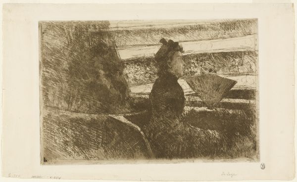 Curator: Eric Forbes-Robertson's "In the Forest, Pont-Aven" presents two figures amidst foliage, its dimensions roughly 68 by 90 centimeters. Editor: It’s quite somber. The heavy use of muted tones and obscured faces gives it a secretive, almost melancholic mood. Curator: Forbes-Robertson would have been working in an era grappling with industrialization, so his return to these seemingly simple, pastoral scenes speaks to a societal yearning. Editor: Look at the woman knitting, though. Knitting is almost always a symbol of domesticity, of cyclical time, of the Fates themselves weaving destiny. Curator: Yes, the labor involved speaks directly to production. The textile she creates has a purpose, a function within the world outside the canvas. Editor: I still wonder about the facelessness. Are they archetypes? Are they meant to represent something beyond their individual selves? Curator: It's an intriguing question—how much does their anonymity allow us to project our own experiences of labor, of production, of purpose onto them? Editor: A lot to ponder, indeed. Curator: Absolutely. A fascinating intersection of the material and the symbolic.