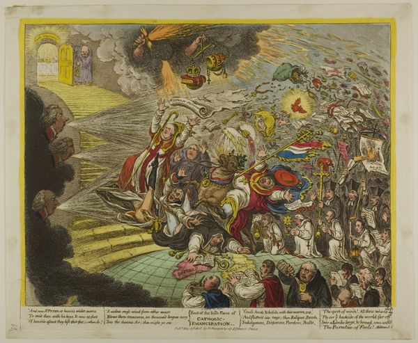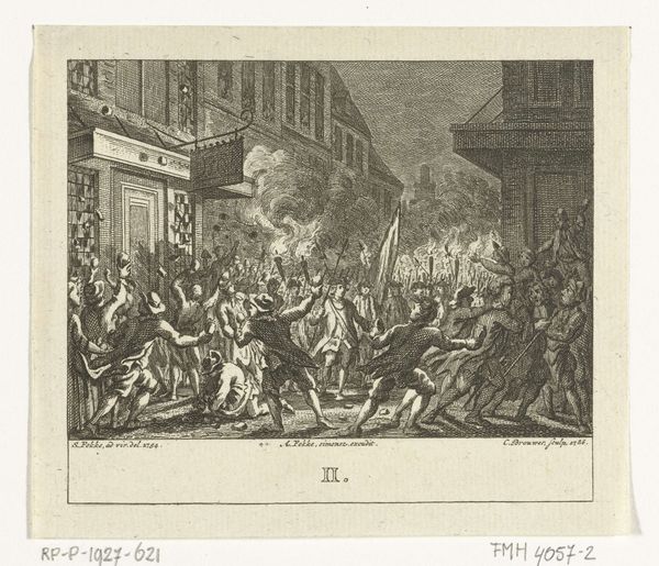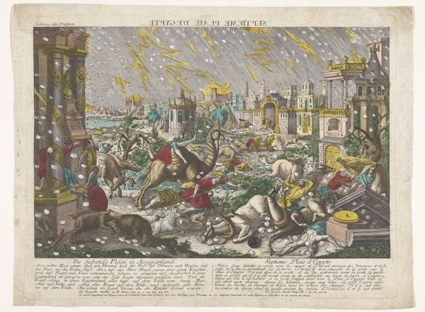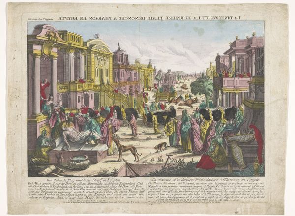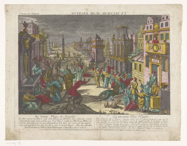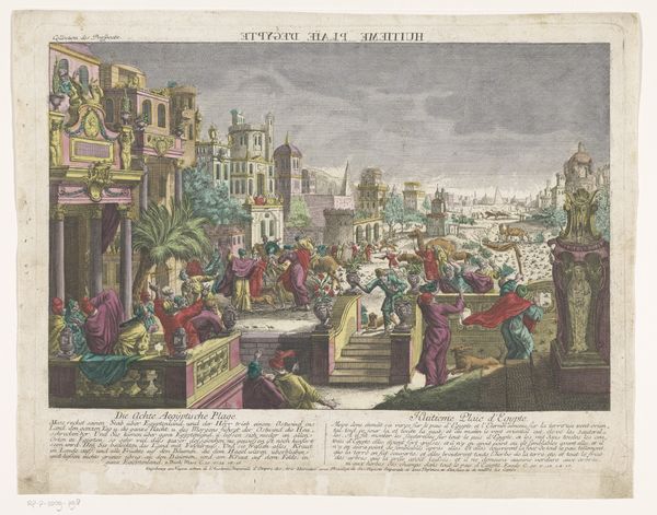 Editor: This mixed-media print, "De Zesde Plaaq in Egypte" or "The Sixth Plague in Egypt," dating back to the late 18th century, presents a scene of chaos. It looks like some type of epidemic, a plague maybe. The architecture seems important, but I don't really get what's going on... What do you see in this work? Curator: This Baroque print depicts a powerful biblical scene through a lens of societal disruption and divine intervention, focusing on power structures. How are those in power, like Pharaoh and his magicians, rendered helpless? What does it suggest about societal hierarchies in times of crisis? Notice how the artist chose to portray the afflicted and the unconcerned, perhaps mirroring the social stratification prevalent during its creation. How does this plague narrative serve as a critique of unchecked authority? Editor: So, you’re saying the artist is less interested in the religious aspect and more in making a commentary about social power and control? Curator: Exactly! The print invites us to consider who benefits from systems of authority and who suffers when those systems are challenged or crumble under the weight of catastrophe. Think of how epidemics disproportionately affect marginalized communities. Editor: That’s a fascinating way to consider historical artwork—connecting it to current discussions around social justice. Thanks for broadening my understanding! Curator: And thank you for your insightful questions! It’s crucial to examine how art from the past continues to speak to our present concerns, offering potent reflections on human experience and political dynamics.