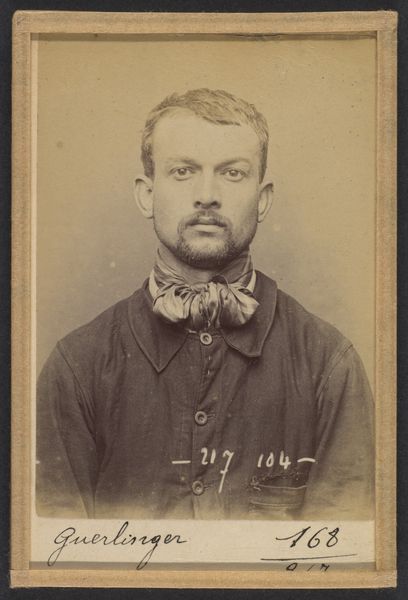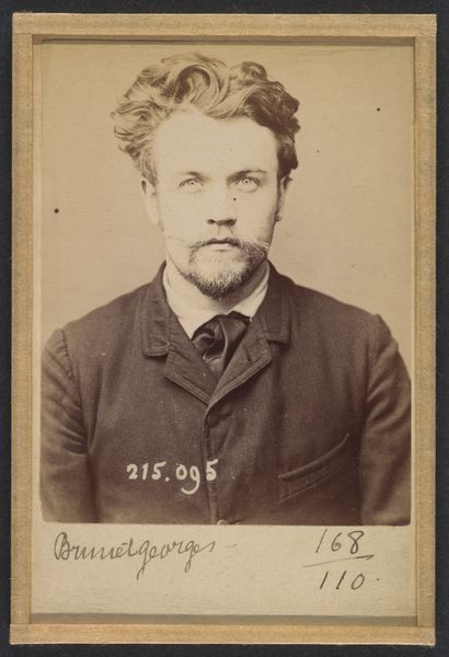Editor: This albumen print from 1894 is a portrait by Alphonse Bertillon. The caption tells us the sitter's name is Georges Pivat, a 34-year-old tailor and anarchist. I find the directness of the gaze somewhat unsettling. What do you see in this piece? Curator: Beyond the aesthetic qualities of a 19th-century portrait, this image carries heavy cultural weight. Consider the context: Bertillon pioneered forensic photography, using it to classify criminals. This wasn't about capturing beauty, but creating a record for control and, in a sense, branding. Editor: Branding? I hadn't considered that. Curator: Yes, think about the date too, 1894. Anarchism was considered a dangerous ideology by some. So, this image isn't just a face; it's a symbol loaded with social anxieties, perhaps designed to evoke a certain fear. Editor: So the suit, the bow tie…are those symbols too? I’d assume someone deemed dangerous would have their appearance downplayed. Curator: Precisely. The ordinary clothes reinforce the fear: danger lurks beneath a veneer of respectability. Think of it as a deliberate contrast, to show how societal norms can be deceived by one deemed an enemy of the state. Do you see how seemingly neutral details actually work to communicate a loaded message? Editor: I do, and I'm struck by how modern this feels. The anxiety about hidden threats, the power of the photographic image…it all resonates today. Thank you! Curator: A potent reminder of how the past continues to shape our present. The power of imagery indeed.