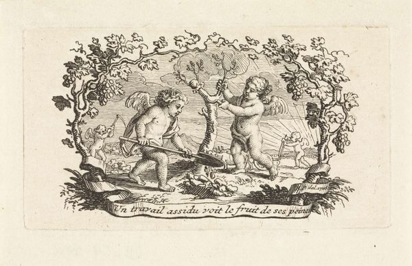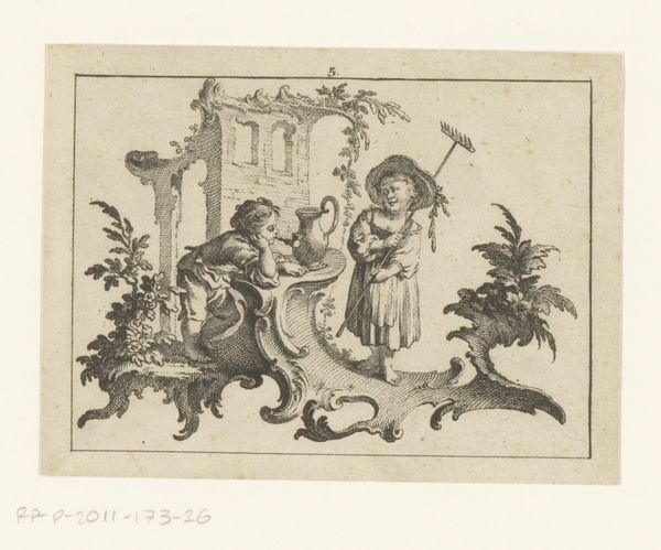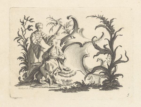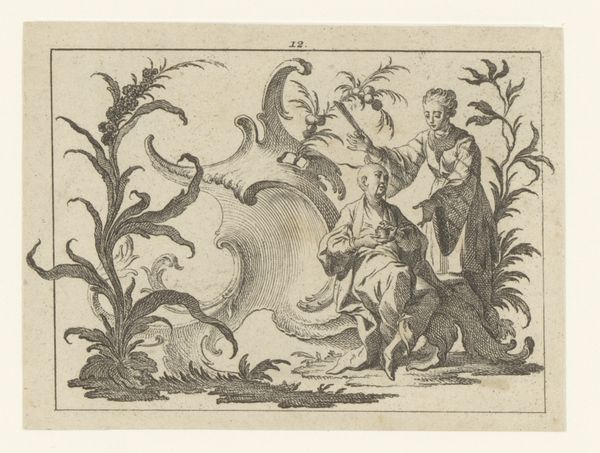 This print, "Seated Woman with a Standing Man with Pipe on a Rococo Ornament," was created by Johann Esaias Nilson in the 18th century. It belongs to a period defined by rigid social hierarchies, where class distinctions were meticulously portrayed in art. At first glance, we see a playful scene, but it invites us to consider the roles and expectations placed upon individuals during this era. The seated woman, modestly dressed, contrasts with the flamboyantly attired man, his pipe a symbol of leisure. The rococo ornament itself, with its swirling, elaborate design, speaks to the aesthetic preferences of the elite. Nilson's work reflects the complex interplay between gender, class, and representation, offering a glimpse into the societal norms that shaped the lives and identities of people in the 1700s. The image presents a narrative, one that prompts us to consider the power dynamics embedded within seemingly innocent scenes.