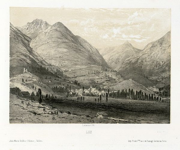 Curator: Before us is "Zicht op Trente," or "View of Trento," created before 1853 by Eugène Cicéri. It’s rendered as an etching and print, currently residing here at the Rijksmuseum. Editor: My immediate impression is one of layered serenity. The crisp precision in the etching gives a real sense of depth as your eye travels into the distance. Curator: Precisely! Notice how Cicéri manipulates line weight. The foreground elements – the buildings and the stone wall – have a much heavier line than the distant mountains, enhancing the perspective. The composition guides our vision carefully. Editor: Yes, and the materiality of the print itself is crucial. Etching allows for the detailed capture of light and shadow, almost imitating a photographic effect despite being entirely hand-crafted. What was Cicéri's own process? Curator: Details surrounding Cicéri’s methods are somewhat sparse, but it's reasonable to presume a preparatory sketch preceded the etching, transferred onto the metal plate for the painstaking process of acid biting to create the recessed lines. This demanded serious time and meticulous craftmanship. Editor: Exactly! Considering the labor-intensive nature of printmaking, the reproduction and dissemination of this view speaks volumes about the demand for images and the broader cultural landscape of the time. Who would have commissioned such a print? Curator: Prints such as this served multiple purposes: documentary records, artistic exercises, and as commercially viable commodities in a burgeoning tourist market. One could say, Cicéri's viewpoint solidifies our own understanding of perspective – our ‘sight’ onto the city, carefully manufactured by the artist. Editor: An interesting notion – especially when you consider that prints like this became affordable for middle-class buyers who weren’t able to travel. This cityscape, this mountain, became accessible because of these reproductive mediums and markets, a world brought into the home through ink and labor. Curator: So while I focused more on Cicéri's masterful composition and line, your interest leads into the print's availability as an artwork intended for circulation. Editor: And hopefully encourages a richer understanding of what informs what we choose to reproduce as representations of beauty, travel, and urban experience. A conversation always worth having.