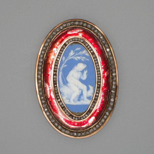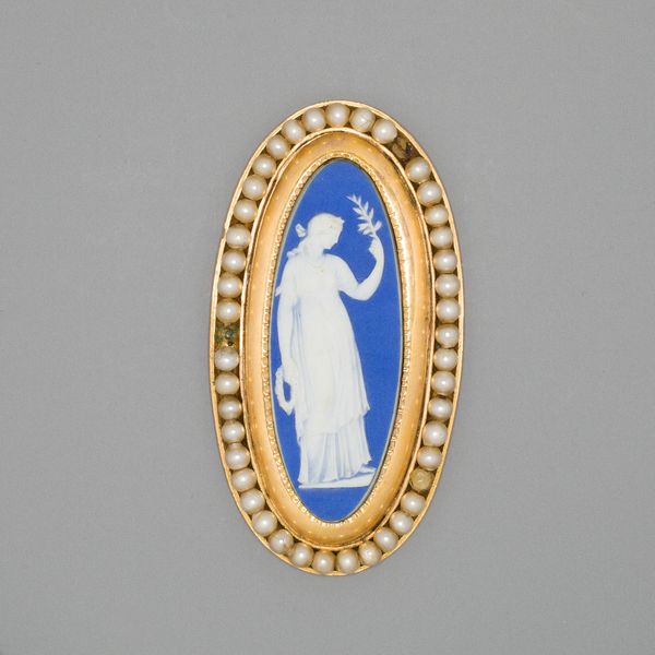 Editor: So, this is a late 18th-century ceramic relief sculpture entitled "Medallion with Classical Figure" from the Wedgwood Manufactory. The contrast between the white figure and the dark blue background is quite striking. What do you see in this piece? Curator: The appropriation of classical imagery during the Neoclassical period is a complex issue. This medallion, for example, isn't just a decorative object. It reflects a desire to connect with the perceived purity and democratic ideals of ancient Greece and Rome, but who got to participate in that fantasy? Editor: What do you mean? Curator: Well, Neoclassicism was embraced by elites. These kinds of objects, with their classical themes, often reinforced existing social hierarchies. Consider who was buying and displaying these items. They often had colonial wealth...and did not necessarily grant women full social participation despite their presence in art objects such as this one. Does seeing it this way shift your perception at all? Editor: Absolutely. I hadn't thought about how the classical references could be used to create a narrative of power. The medallion, beautiful as it is, almost becomes a symbol of exclusion in that light. Curator: Exactly! It invites us to consider the political and social dimensions embedded within seemingly innocent aesthetics. Art rarely exists in a vacuum. Editor: I see now that this isn't just a pretty object; it's a cultural artifact loaded with social and historical meaning. Curator: Precisely. And hopefully it reminds us to look beyond the surface of any work of art.