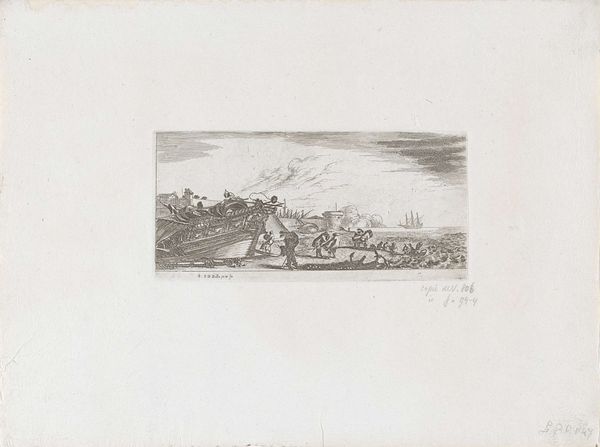 Editor: We're looking at "Zeeslag," a small etching by Stefano della Bella, created sometime between 1620 and 1664. It depicts a naval battle. I find the line work quite delicate, almost fragile, which seems at odds with the violent subject matter. What can you tell me about this depiction of naval conflict? Curator: It’s interesting how you noted that contrast. During the Baroque period, prints like these played a crucial role in shaping public perception of political events. "Zeeslag" – "Sea Battle" – wasn't just documenting a fight; it was participating in the construction of national identity and projecting power. Considering that, how does your understanding of the fragility and violence within the image change? Editor: So, the detail isn’t just decorative but also informational, like early propaganda? How was something like this consumed back then? Curator: Exactly. Prints were relatively accessible. They were distributed and collected, helping to cultivate a sense of shared national experience and pride. These images celebrated military victories and legitimized state power. Do you notice anything about the composition that might further amplify that message? Editor: I guess the detail is important; everything’s very clearly defined despite the small size. The crispness makes the battle seem precise, managed... heroic, almost, even with all the chaos. Curator: Precisely! It presents an idealized vision of warfare, sanitizing the harsh realities. Understanding the socio-political context, the print becomes less a neutral record and more an active participant in shaping historical narratives. And remember, patronage played a massive part, influencing which stories were told and how. Editor: That's really fascinating. I always considered prints as just smaller art pieces. It’s changed my perspective on how artworks actively shape history and national identity. Curator: Indeed! It highlights the critical role of images in the formation and dissemination of national narratives, making us question what’s being amplified, and what isn't. A key to approaching historical depictions of power!