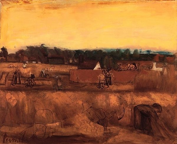 David Burliuk's painting "Mount Zion, Israel" captures a vibrant scene of everyday life in early 20th-century Jerusalem. Burliuk, a key figure in the Russian avant-garde, emigrated to the United States in 1922, later making several trips to Israel. Here, Burliuk presents a modern Mount Zion. An earth tone palette constructs the rolling hills that are punctuated by a lively procession of people. Figures from different walks of life populate the scene; from what appears to be Orthodox Jews, to families, and individuals riding animals, the painting presents a microcosm of Israeli society. Burliuk, like many early modernists, was fascinated with folk art traditions and naive styles of painting, which is evident in his simplified forms and bright colors. By capturing these intimate moments, Burliuk offers a complex portrait of a community rooted in historical tension, yet thriving with life and diversity. He asks us to consider the multifaceted identities that converge in this sacred space.