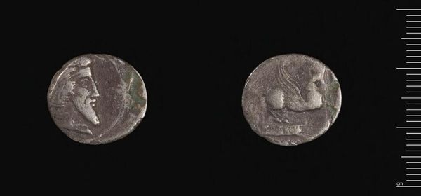 Curator: It's like holding a tiny, tarnished mirror to the past. Editor: Indeed. This is a denarius, a Roman silver coin. It was made by C. Hosidius Geta. Look closely at the process; each strike must have been so precise to get this level of detail. Curator: I'm struck by how worn it is, like a smooth stone carried for centuries. All the hands it must have passed through. Editor: Think of the silver itself, mined, smelted, purified. It represents labor, power, and trade routes stretching across the empire. Curator: And the images—a woman in a helmet on one side, a boar on the other. Symbols meant to resonate then, now whispering to us. Editor: Exactly, a tangible link to Rome. Curator: It makes you wonder about the stories this coin could tell. Editor: The story of its making is just as important. Curator: True, the intersection is quite lovely to consider. Editor: A tiny object, brimming with material and symbolic weight.