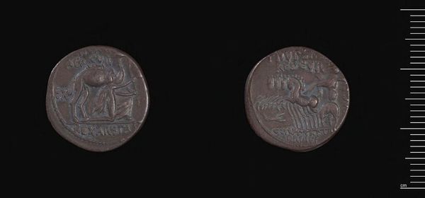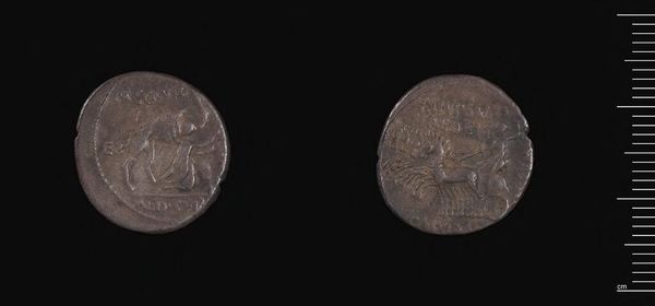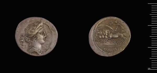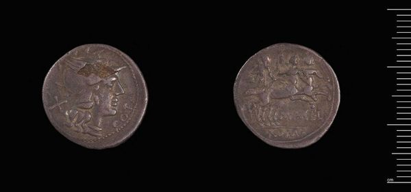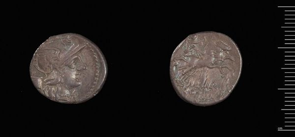 Curator: Here we have a denarius, a Roman silver coin, of P. Cornelius P.f. Sulla, now residing in the Harvard Art Museums. Editor: It's surprisingly small, yet the images are remarkably detailed, despite the wear and tear. You can almost feel the weight of history it carries. Curator: Indeed. The coin is not just currency; it's a piece of propaganda. On one side, we see the head of Roma, the personification of Rome, while the other depicts a chariot scene. Editor: Looking at the craftsmanship, the detail on the horses and the figure in the chariot is striking. The process of die-striking these coins must have required skilled labor. Curator: Absolutely. These coins were integral to Roman society, facilitating trade and projecting power. This one reminds us how art was used in public life. Editor: It's incredible to think about who might have held this coin and the transactions it facilitated. An object of art, labor, and material value, all in one.