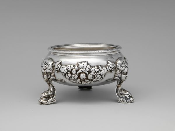 This ornate 'Salt' cellar was crafted in silver by Andrew Ellicott Warner, sometime in the 19th century. Its small size belies a wealth of detail, inviting close scrutiny. The piece employs a tripartite structure: the bowl, adorned with delicate floral repoussé work, sits atop scrolling legs that resolve into decorative feet. The bowl's edge, with its scalloped and textured rim, presents a tactile contrast to the smooth interior, hinting at the preciousness of the contents it once held. The use of silver is not merely material; it speaks to the cultural codes of luxury and status. Each carefully rendered petal and curve catches the light, animating the surface and transforming a utilitarian object into a miniature sculpture. Consider how this piece functions aesthetically and as a marker of social identity, reflecting broader cultural values of refinement and display.