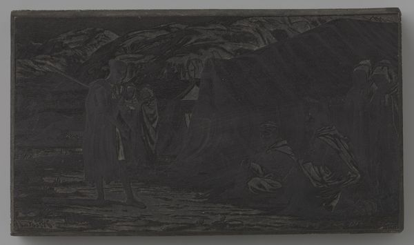 Editor: We’re looking at "Zittende schaapherder," or "Seated Shepherd," a watercolor by Willem Witsen from around 1885. It’s quite muted and seems to capture a solitary figure within a very indistinct landscape. The brushwork is soft. What strikes you about its composition? Curator: The interest, structurally, lies in how Witsen uses a limited palette to create spatial depth. Observe the horizontal layering: the foreground, rendered with dense, almost frantic strokes, gives way to a subtly indicated middle ground and a hazy horizon. The shepherd is vertically centralized, creating a focal point, but also acting as a visual anchor amidst the indistinct planes. It invites contemplation. Editor: I see that. But doesn't the monochromatic color scheme flatten the composition somewhat? Curator: Not entirely. The tonal variations, though subtle, are key. Consider how the artist utilizes washes to suggest receding space versus tighter, drier brushwork for textural detail in the foreground. The strategic placement of lighter values suggests the presence of a distant light source. Editor: So the lack of distinct form actually contributes to a sense of atmosphere and space. Curator: Precisely. Witsen's choice of watercolor also allows for a certain degree of spontaneity and transparency, contributing to the work's ethereal quality. This creates, then, what one could regard as not just representational scenery, but the appearance of transience itself. Editor: That's a good point, I had only seen a depiction, not considered transience, well, thanks for that! Curator: You’re welcome. The beauty is found within these material-based considerations, wouldn't you say?