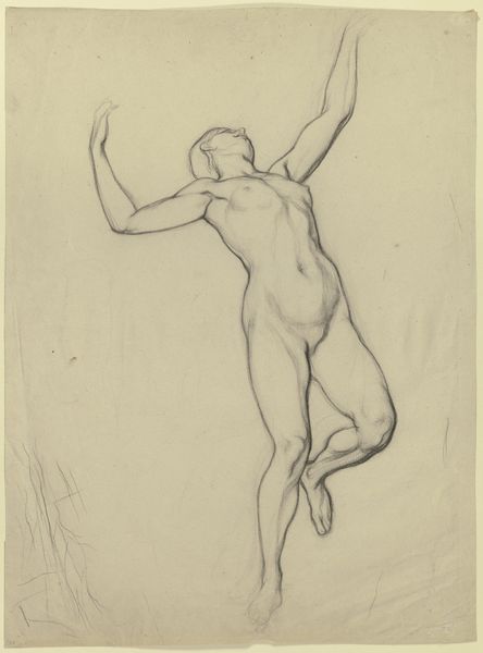 Editor: We are looking at "Picture to picture game boy," a pencil drawing by Kuzma Petrov-Vodkin from 1911. It's a nude figure, quickly sketched. What really strikes me is how the line work, though unfinished in places, still manages to convey a sense of dynamic movement and balance. What stands out to you in this piece? Curator: The dynamism you observe arises from the strategic deployment of line weight and directional force. Note how the heavier, more deliberate lines articulate the figure's torso and right leg, grounding him, while the lighter, sketchier lines around the outstretched limbs suggest potential energy, a body poised in transition. Observe also the use of hatching to create volume and shadow. How would you describe the spatial relationships created solely through the varying densities of line? Editor: I see what you mean! The darker lines definitely push the figure forward, making him feel more present, while the lighter lines almost fade into the background, suggesting the space around him. So the shading doesn’t just describe the form, it helps create depth too? Curator: Precisely. The artist is not merely representing a body; he is constructing a pictorial space using the inherent qualities of line. Notice also how the abstract lines in the background interact with the figure. Do they provide context, or do they serve primarily as compositional elements that draw our eyes to certain directions of the overall line composition and rhythm in the work? Editor: I'd say more the latter, because the background is so undefined; it almost feels like he wanted to emphasize the shape and form of the figure itself without distractions. I guess that helps focus our attention on the figure's movement. Curator: A crucial insight. The formal elements, line, tone, and composition are of central importance here. By focusing on the artist's control over these elements, we understand how Petrov-Vodkin translated a subject into a self-contained aesthetic experience. Editor: This has been really helpful to think about how something as simple as line and shading can completely transform the feeling of an image. Curator: Indeed, attending to the artist's material and technical choices, can illuminate aspects of the composition that would not otherwise be noticeable.
