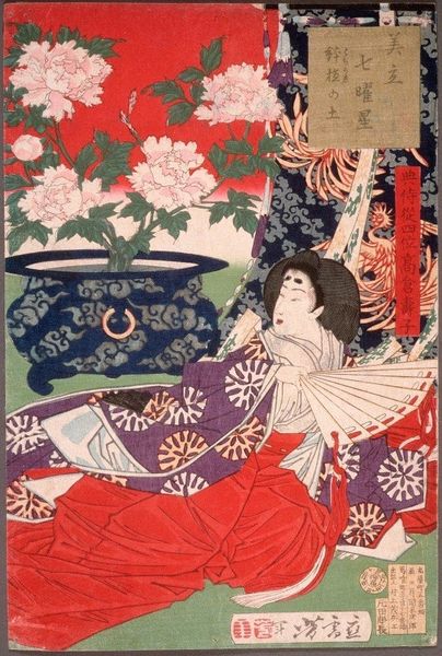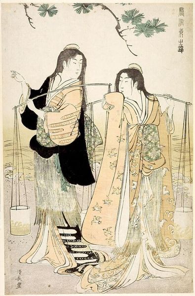 Editor: This is "Scene on a Beach," a woodblock print by Kitagawa Utamaro II. The figures seem to be at rest, but there’s something unsettling in the composition. What are your thoughts about this piece? Curator: Note the careful arrangement of figures, each connected by costume patterns, gestures, or gazes. Do you see how the waves in the background mirror the emotional undercurrent of the scene, linking humanity and nature through visual rhymes? Editor: I do, and the child playing with what seems to be food, and the lanterns in the upper right! Are these all symbolic? Curator: Precisely! Lanterns often indicate a festival, but they can also illuminate hidden feelings. The child’s actions are less playful, perhaps hinting at future anxieties. It's a blend of celebration and foreboding. Editor: It’s interesting how Utamaro II imbued such depth into a seemingly simple scene. Curator: Indeed, he used commonplace imagery to unveil deeper psychological layers, showing cultural memory and unspoken truths.