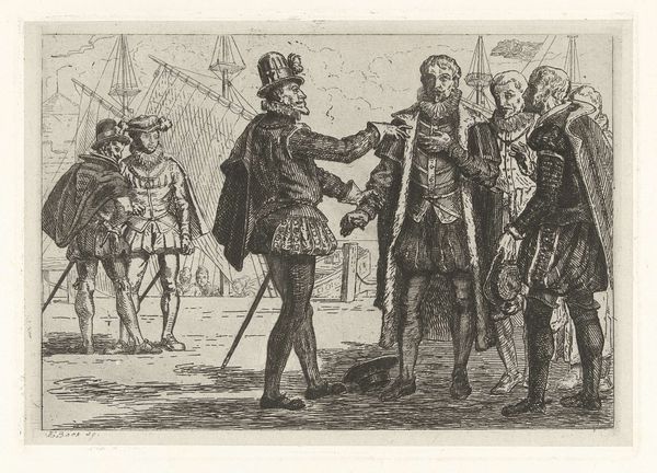 Editor: Here we have Vasily Vereshchagin’s 1864 charcoal drawing, "Presentation of the Bosses (Russian officer and Caucasians)." It's striking how the artist uses the contrast of light and shadow to emphasize the distinct groups within the composition. What strikes you most about the cultural context suggested here? Curator: The gathering depicted presents us with a potent symbol: the clash and negotiation between cultures. Note the way the artist depicts the Russian officers in their formal, upright posture, contrasting sharply with the gathered Caucasians who, though presented as a group, possess individual, weathered faces. Editor: Yes, their faces do tell individual stories, don’t they? Curator: Precisely! Consider also their dress – the headwear, the coats. These aren't just details; they're markers of identity, resilience, and perhaps even resistance. This image seems to be steeped in power dynamics. What emotional weight do you think these symbols carry? Editor: I think they are somber and contemplative, weighted by the gaze of those who know their land has been encroached. Almost as if they expect an uneven exchange. Curator: I agree. The almost uniform submissive stance contributes to this mood, a poignant meditation on cultural encounter and its lasting psychological impact, don't you think? What does it tell us about cultural memory, perhaps? Editor: I now recognize how cultural memory informs visual language, especially the depiction of cultural encounter and negotiation. The somber, almost resigned stances of the Caucasians compared to the officers says so much about what they had endured. Curator: Indeed. It makes us contemplate the narrative of this historical moment. It’s as if the symbols invite a prolonged reflection, reaching into the heart of cultural experience and lasting impressions.