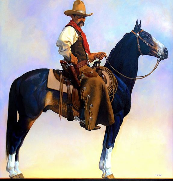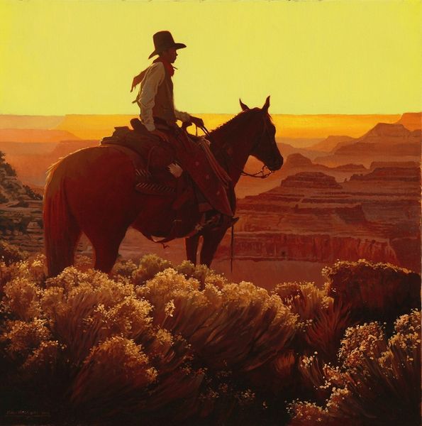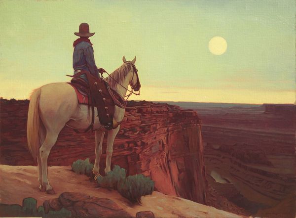Editor: This is Joshua LaRock’s "Headwinds," an oil painting. There isn't a date provided, which is a bit frustrating. I'm immediately drawn to the realistic depiction and the almost cinematic quality of the lone rider. What do you see in this piece, particularly from a socio-historical perspective? Curator: "Headwinds" presents an interesting intersection of classic Western iconography and contemporary artistic practice. LaRock engages with the myth of the cowboy, a figure deeply embedded in the narratives of American identity and expansionism. But what does it mean to revive this imagery today, especially given our increased awareness of the violence and displacement upon which the West was built? Editor: That’s a very different angle than I was expecting. So you're suggesting the painting asks us to confront the complexities and maybe even the darker sides of the romanticized 'Wild West'? Curator: Exactly. Consider the underrepresentation and marginalization of Native communities within these very landscapes. How can we critically re-evaluate this representation? What is missing from the story that we can explore through the artwork’s theme? Editor: It is hard not to see this painting through modern perspectives... How does the artist’s choice to paint in the "plein-air" style inform these considerations? Curator: Painting "en plein air" suggests a direct encounter with the land. Here, I see a way for the artist to reconcile historical imagination and lived experience, and even engage the contemporary experience of living in a place that has that specific legacy. Can we separate that experience, that feeling of place, from the historical burdens you are hinting at? I want us to reflect on the historical layers present within that landscape. Editor: I see what you mean. Thinking about the painting as part of a larger narrative about the land changes the way I look at the subject itself. Curator: Precisely. It is crucial to engage with art not just for its aesthetic qualities but also for its potential to provoke conversations about power, history, and representation.