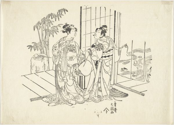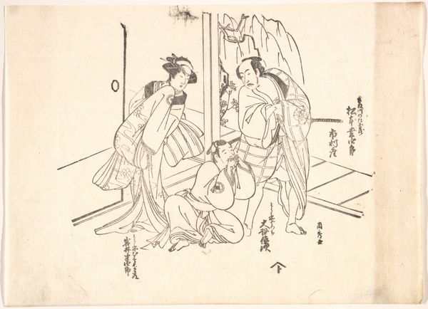 Curator: Ah, let's discuss "The Actors," a woodblock print in ink, brought to life by Ippitsusai Buncho between 1723 and 1792. It currently resides here at the Metropolitan Museum of Art. Editor: I'm immediately struck by how economical the lines are, yet they convey so much. It’s like a whisper of a scene, but full of poised anticipation. Curator: Precisely! Buncho was a master of ukiyo-e, capturing the fleeting moments of everyday life and the theater. The actors themselves, rendered with such precise lines, become symbols of the drama inherent in human interaction. Their elaborate robes hint at their roles. Editor: The detail in those robes! They almost overshadow the faces. I wonder, is it intentional? Do the costumes speak louder than the players themselves, like a commentary on societal roles? Curator: The attire indeed signifies their status within the Kabuki tradition. The male figure, possibly holding a flute, exudes an almost exaggerated confidence; meanwhile, the woman’s gesture towards what seems to be an offering… It’s all quite deliberate. Think of the Kimono as text; Buncho's astute viewers could immediately read these visual signs and allusions. Editor: And behind them, that minimalist landscape through the window – it's like another stage set. It is so strange to see nature as another set decoration. I am used to western painting where it acts as something to be reckoned with in all its romantic power. Curator: Indeed. Landscape in Ukiyo-e provides an active commentary on character psychology. Remember, too, that Ukiyo-e prints held considerable social weight and popular appeal beyond their aesthetic value, capturing moments and figures that resonated deeply within contemporary Japanese society. These actors would be celebrities! Editor: So true. There's a delightful flatness to the whole scene that somehow enhances its depth, its potential narrative. And knowing this was reproduced and disseminated… it's not just a single image; it’s a cultural echo. It's incredible to think about all of those cultural ripples made from what seem like these simple means. Curator: Ukiyo-e as media. The essence of theater immortalized and proliferated. Each print carries this potent mixture of performance, symbol, and collective memory. Editor: It really gets under your skin when you consider the historical context.