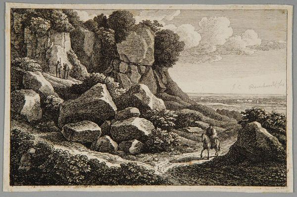 Curator: This is "? Timms's" "Muleteers," and while we don't have a precise date, it resides within our collection here at the Harvard Art Museums. Editor: The high contrast immediately strikes me; the etching creates this very dramatic landscape. Curator: Look at the figures carefully, though, and consider their role. The muleteers represent a laboring class, often marginalized. Editor: The figures are almost overwhelmed by the landscape; they punctuate the space, but it's very much about the formal interplay of light and shadow, line and texture. Curator: I see them as symbols of resilience, navigating challenging terrains both physically and socioeconomically. How might their gender or origin affect their experiences? Editor: Perhaps, but to me, the artist is mostly concerned with the visual harmony, that satisfying balance between the dark mass of the hill and the delicate lines of the sky. Curator: It's hard not to wonder about the role of the viewer in the depicted society, and their own potential complicity in the depicted power dynamics. Editor: Yes, but even if that is true, you cannot say that the formal mastery and visual intrigue doesn't speak for itself. Curator: Perhaps both perspectives are relevant here. Editor: Indeed.