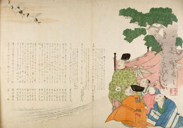 Editor: This print, "Still Life of Konbu Seaweed and Nandina Wrapped in Bamboo Leaves" by Kubo Shunman, presents a quiet stillness. The calligraphy surrounding the central image strikes me as integral to the work. How do you interpret this combination of image and text? Curator: The calligraphy interweaves with the still life, echoing the cyclical nature of life and art. Notice how the bamboo leaves cocoon the nandina and konbu. These objects resonate with traditional symbolism of resilience, purification and long life. They speak to a desire for cultural continuity, don't you think? Editor: I hadn't considered the idea of continuity so explicitly, but that makes perfect sense. Curator: The careful arrangement implies a constructed memory, a consciously preserved identity through symbolic objects. It is as if Shunman is composing a cultural poem through images. Editor: This has broadened my understanding of how objects carry embedded cultural and emotional meaning, especially when connected to written expressions.