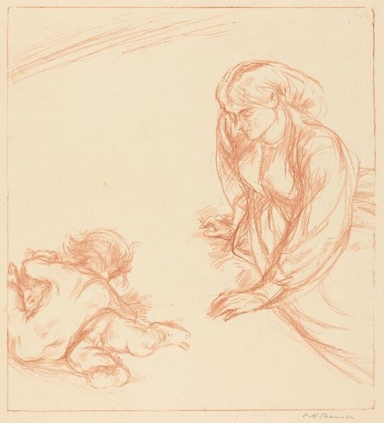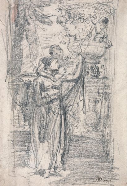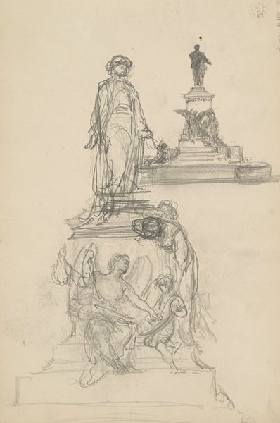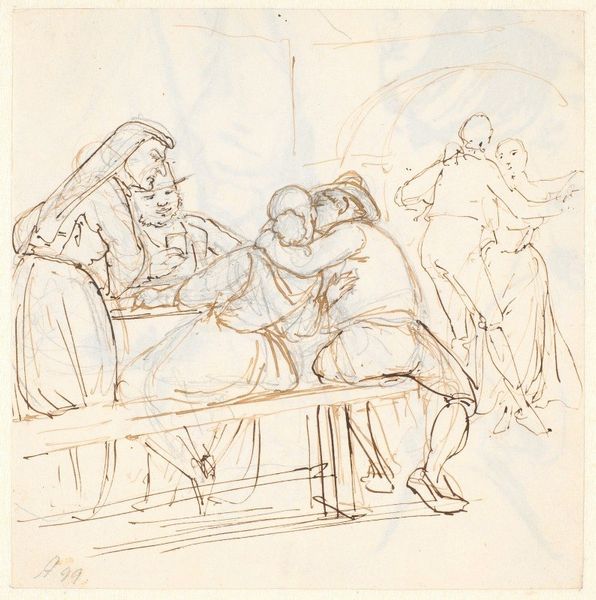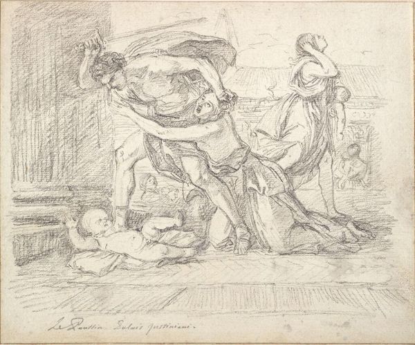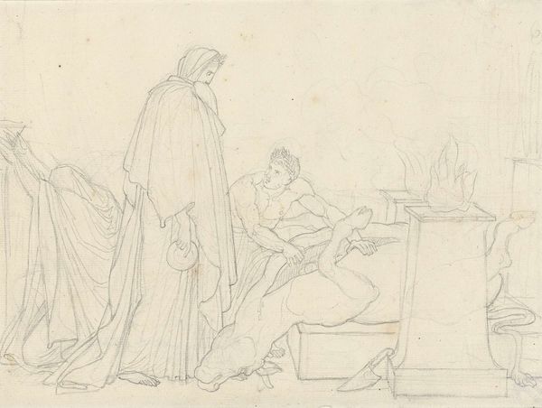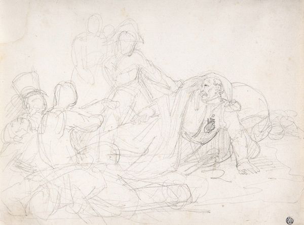 Curator: Józef Simmler created this drawing, "A woman with two children with a hand extended in a gesture of begging," in 1856, utilizing pencil on paper. It clearly depicts a scene of poverty. Editor: My first impression is of raw vulnerability. The sketchiness of the lines emphasizes the fragility of their situation. Look at the almost pleading gesture of the woman’s raised hand, and the huddled forms of the children! Curator: This drawing reflects the rise of Romanticism's interest in depicting social issues. Simmler engages with a visual language common in academic painting while focusing on the harsh realities of the mid-19th century. The woman’s plea for help echoes calls for social reform and challenges the viewer's conscience. It's intended to incite empathy, and perhaps even action, amongst the emerging bourgeois class. Editor: Exactly. Consider the materiality: it's pencil on paper. Accessible, readily available materials, nothing ostentatious here. The artist is making a clear choice to use a medium that feels immediate, less ‘precious’ than oil paint, emphasizing the urgency of the scene. Notice how the column on the right is elegantly rendered but feels almost mocking given the destitute figures on the left. Curator: It’s interesting how the artist places them adjacent to that architectural detail, a common backdrop in higher art— a sort of loaded staging for this family’s drama. But, crucially, Simmler places them outside the structures of power and wealth. He invites the audience to reflect on the structures of inequality shaping society. Editor: The unfinished quality actually heightens the sense of realism for me, almost as if he’s snatched a moment from the street before him, before it vanishes. One can feel the precariousness in the very lines he uses. It also speaks to the laborious process and time commitment such detailed, albeit spare, works demanded of artists at the time. Curator: Absolutely, it speaks to his training but also highlights his critical eye to his moment. Simmler offers a compelling indictment of societal inequalities while situating his work in established art traditions. Editor: In this piece, Simmler forces us to contemplate the physical hardship endured, prompting a closer examination of how everyday materials carry deep socio-political meaning. Curator: I'm struck by how he makes us confront not only the poverty but the broader societal structures that perpetuate it. Editor: For me, it is the unembellished quality of the material and the immediacy of the work itself that drives home the desperation of the figures depicted and, in doing so, it challenges any romanticized vision of the past.