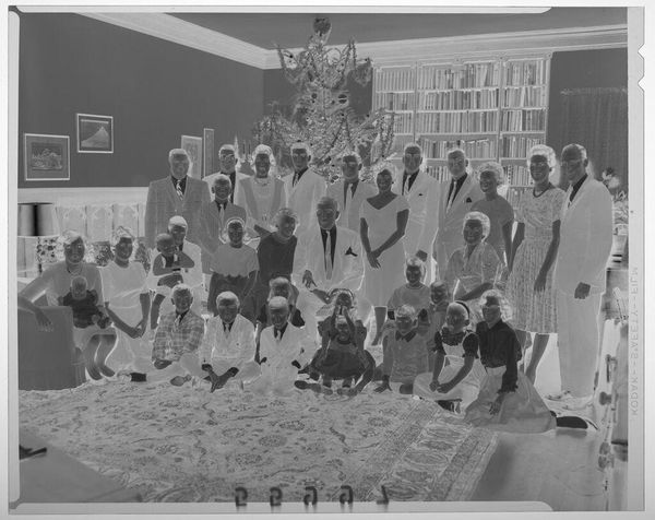 Curator: This gelatin silver print by John Deusing shows students in prom attire seated along the edge of a room. The tonality strikes me first; it's almost ghostly. Editor: Indeed, the inverted contrast contributes to a sense of unease, of a hidden narrative. Observe how the banner, "We Dare to Be Different," speaks volumes about societal pressures. Curator: The careful arrangement, the way their clothes define each figure, speaks to the rituals around social gatherings. Each is a study in form and texture. Editor: And what forms those textures? Hierarchy, expectation, and social performance. I wonder, were these students "daring to be different" in ways that challenged the establishment? Curator: Regardless, there is something both poignant and enduring in Deusing's composition and light values. Editor: Yes, a testament to the photographic medium's power as a time capsule and cultural artifact.