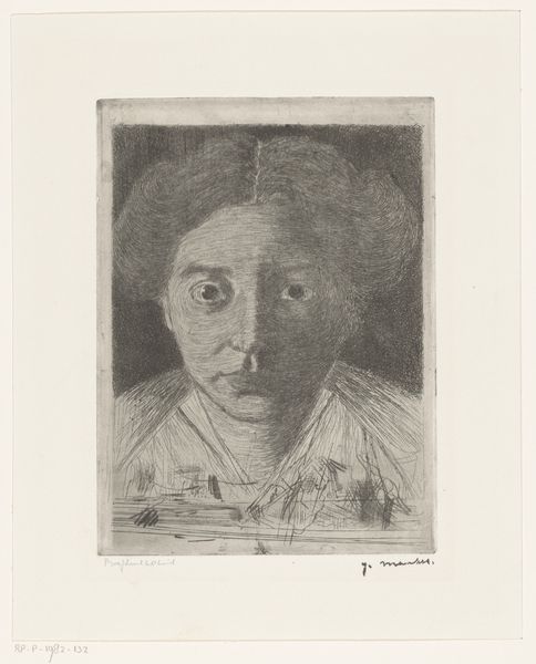 Jan Mankes made this self-portrait with a mustache as an etching; the date is unknown, but it was likely produced early in the 20th century. Etching is this amazing, time-consuming, indirect way of making a drawing. It is a real commitment! What's cool here is the amount of cross-hatching. Look closely at the network of tiny lines, like a swarm of gnats circling his face. Each mark is carefully placed, building up tone and shadow. The artist's hand feels present in every stroke, revealing the process of its making. Mankes creates a portrait that feels both intimate and a little distant. The overall effect reminds me of some of the early modern printmakers like Käthe Kollwitz. Both have this knack for conveying deep emotion through simple means. Ultimately, what makes this print so compelling is its quiet intensity, a testament to the power of art to capture something essential about the human condition.