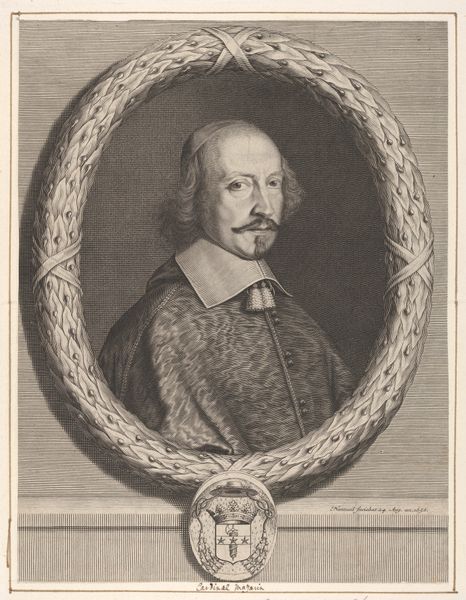 Curator: Before us we have Robert Nanteuil's "Cardinal Mazarin," a striking portrait from the Harvard Art Museums. Editor: The texture is immediately what grabs me. The fur looks so soft, the laurel wreath so precisely rendered. It’s a study in contrasts, softness against hardness. Curator: Absolutely. Nanteuil was the official engraver to Louis XIV, and this portrait captures Mazarin's immense power and influence. The laurel wreath and coat of arms emphasize his stature. Editor: But also, the subtle gradations of light and shadow...see how they define the face, lending it a sense of depth and character. It's masterfully done. Curator: Indeed. Mazarin was a controversial figure, and Nanteuil walks a fine line, presenting him as both powerful and… perhaps a bit weary. Editor: A psychological complexity emerges from this tight composition. It really is a remarkable interplay of technique and subject. Curator: It shows how art is always embedded in historical power dynamics, but also open to formal innovation. Editor: A perfect example of how formal elements contribute to the portrayal of power.