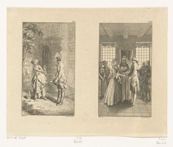Curator: What a find! This is "Three Scenes from Shakespeare’s Merry Wives of Windsor" by Daniel Nikolaus Chodowiecki, created in 1786. It's an engraving. Three panels depict scenes from the play, and there's text beneath each, in German, I think. Editor: My initial reaction is of looking at a series of symbolic acts. There's such meticulous detail. Look at Falstaff! His ego inflated like a puffed-up balloon about to burst. Is this morality theater, then, with Falstaff embodying vanity or delusion? Curator: That's what grabs you, too? Falstaff's size dominates each panel, almost comically so, against the more subtle interiors and exteriors. Consider how costume transforms Falstaff into something other. He goes from pompous innkeeper, to almost a grotesque clown-like parody of manhood, to something far more pitiable… almost dog-like, really, hounded out into the forest by mischievous faeries. Chodowiecki captured that arc. Editor: The stag antlers crowning Falstaff signal a sort of symbolic castration, a shaming through animal association, don’t you think? We often think of animal symbols of passion like lions, bulls and snakes; deer often relate to humility and a quiet inner life. In this sense, antlers represent inner values placed where ego once thrived. Chodowiecki uses this detail so subtly but also perfectly. It shows a deep understanding of archetypes. Curator: It’s amazing how much narrative detail Chodowiecki packs in – look at the expressions on the women's faces! They range from amusement to outright malicious glee. The overall effect feels… intimate. It is theatre, yes, but portrayed at such close range, inviting us to take part. To experience that public shaming ourselves, too. But you make an important point - the image becomes something more complex and archetypal thanks to those symbol associations. The viewer becomes witness to more than a story, but an elemental truth. Editor: And the act of creating art carries with it echoes of how cultures change—an evolution of thought mirrored and reinforced across each culture where we celebrate theater! It all builds upon older ideas and cultural reference points. So much is transmitted by that image and through the generations—cultural memory itself! Curator: Exactly. He wasn't just illustrating a play; he was interpreting enduring themes, weaving layers of human experiences that stretch far beyond 18th-century England. That's how Chodowiecki makes something special. Editor: An intriguing glimpse into the layers of this scene. Something new to learn from something so seemingly simple.