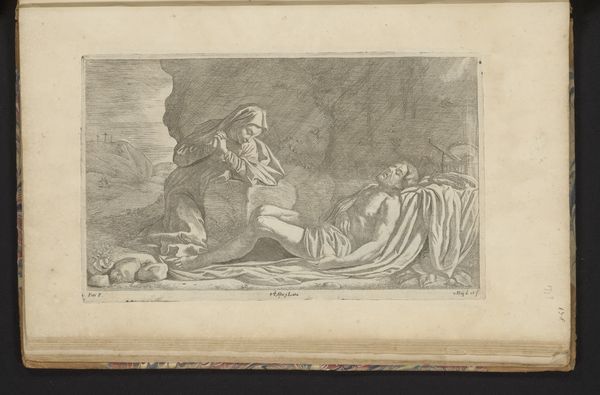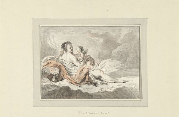 Curator: What a delicately rendered scene. Louis Marin Bonnet created this etching, “Venus wordt verrast door Cupido,” sometime between 1757 and 1793. It’s currently held in the Rijksmuseum. Editor: It has such an airy quality. The composition feels balanced, but relaxed. A sensual depiction, to be sure. Curator: Rococo artists certainly had a flair for depicting sensuality, but beyond that, Bonnet’s choice of engraving and etching reveals a conscious decision to engage with a printmaking tradition rooted in accessibility. Prints allowed wider audiences to consume images, democratizing art. Editor: While appreciating its social accessibility, the artistry lies in Bonnet’s manipulation of line and tone. Observe the hatching and cross-hatching creating volume and shadow. The muted palette emphasizes form, and the softness really invites the eye to explore the whole scene. Curator: Exactly, the choice of such soft colours probably came from Bonnet's intent to create art to cater for more affluent consumers, who wanted to buy more luxury art pieces. Editor: There's a deliberate choice to flatten and almost fade at the corners to frame the action in a more intimate space, but at the expense of full understanding of the context. Curator: The theme reflects the prevailing social values, which in turn can have an economic value. As always with those commissions, right? Venus, surprised by Cupid, reminds us of the ideal beauty and domesticity that shaped elite life in the 18th century. It’s both an intimate portrayal, as you mentioned, but also a carefully crafted piece of propaganda for its intended viewership. Editor: Precisely. The work allows one to understand the formal language being employed at the time to shape consumer behaviours. Well, thinking about the context that inspired its existence, my eyes have become way more critical, as opposed to being initially purely appreciative. Curator: It’s remarkable how analyzing the material production allows us a fuller understanding of even seemingly light and airy scenes.
