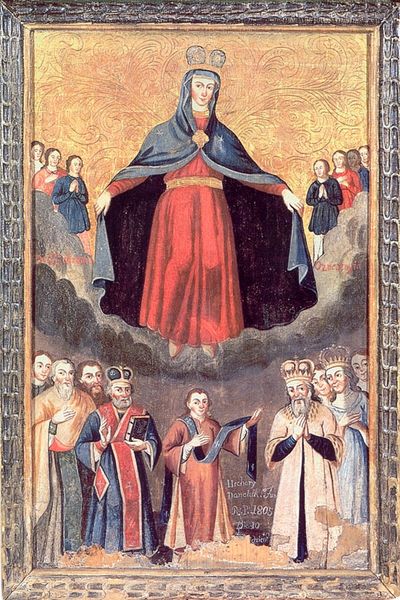Robert Campin painted this ‘Holy Virgin in Glory’ using oil on panel. Here, the Virgin Mary sits enthroned, a beacon of divine motherhood and grace. Note the keys held by Saint Peter. Keys, traditionally symbols of authority, are linked to Peter as the gatekeeper of Heaven. This motif appears across centuries, from Roman depictions of Janus, the two-faced god of doorways, to heraldic symbols signifying dominion. The act of kneeling, displayed by the monk, is not merely submission but a potent gesture of reverence and supplication. It's a posture we see echoed in ancient Egyptian art, where pharaohs kneel before their gods, and later, in Renaissance portraits, where patrons kneel in devotion. This physical act embeds deep psychological roots, triggering primal associations of humility and seeking divine favor. These symbols traverse time, shifting in appearance but holding fast to fundamental human emotions. This image is a crossroads where the past informs the present, and where collective memory shapes our understanding of the divine.