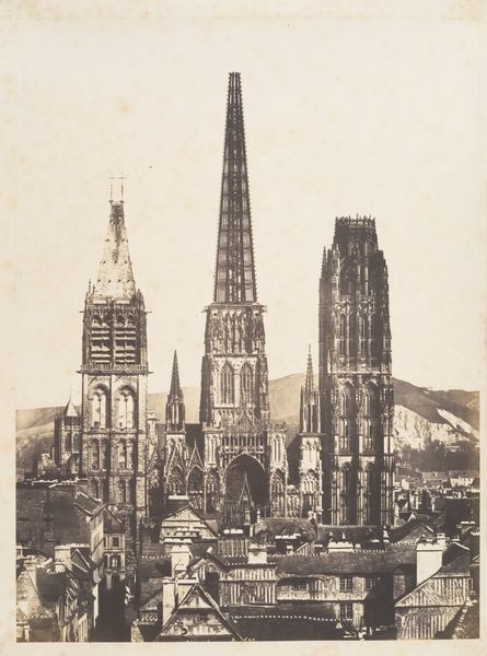 Curator: Let’s delve into this stunning photographic print attributed to Bisson Frères, possibly from 1854, showcasing the West Facade of Chartres Cathedral. Its gothic architecture absolutely dominates the cityscape captured in this image. Editor: Wow, what a powerful visual statement! The cathedral just leaps out, towering over those houses like a giant observing a village of miniatures. There’s an almost… oppressive feeling to it, even in monochrome. Curator: I think that “oppressive feeling” speaks volumes. Consider the historical context: the Church's immense power, its control over knowledge and resources. The Gothic style, while visually awe-inspiring, also served to impress upon the masses their relative insignificance within the divine order. Editor: Exactly. It’s grand, it’s magnificent, and slightly terrifying! I wonder if the photographers intended that? The light… it makes the cathedral appear so solid and unwavering against the delicate texture of the houses, each with its own identity. Almost makes me wanna pick a fight with it. Curator: I love how you're picking up on the tension. Note the photograph was probably taken when the building was undergoing some type of repairs, as is evidenced by the scaffolding. Construction, deconstruction, reconstruction -- all part of the long process of how this society saw its spiritual home. Consider that photography itself was relatively new; this artwork represents the historical impact and shift towards using new technologies to immortalize architecture. Editor: A cathedral wearing scaffolding—talk about revealing vulnerabilities! Maybe that’s what intrigues me, the imperfection. It reminds us that these symbols of permanence are perpetually in flux, products of the people, changing along with our perspectives. The soft greys contribute too. It's stately and historical but lacks rigidity. Curator: The fact that you identify this as a slightly soft rendering is interesting; this choice, either purposeful or imposed, softens a little bit the ideological intentions behind the church, providing almost an inviting approach to such institutions. Editor: This feels really significant seen with my 21st-century lenses. There is a conversation in architecture between intent, perception, decay, repair… The conversation changes as we change, as cultures transform themselves. Curator: Yes, exactly. This artwork opens avenues for many more dialogues of art, gender, class, race, and the role of the artist in these conversations. It gives context to it. Editor: Seeing through your eyes, this becomes not just a pretty architectural picture but a cultural artifact that never stops speaking to us!