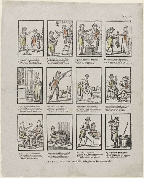 Curator: Looking at this print from the Rijksmuseum, a piece entitled "Als gij deez' lieve prentjes ziet / Herkent gij dan van Alphen niet. / Kent gij zijn lieve versjes nog? / Ik bid het u, onthoudt die toch" made between 1848 and 1881 by Lutkie & Cranenburg, I'm immediately struck by its quaint, almost storyboard-like presentation. Editor: Yes, it has that visual grammar. My first impression is how the sequence gives a charming and somewhat antiquated feeling. The style, in its simplicity, makes it immediately accessible, recalling perhaps early comic strips or illustrations from children’s books. It really transports you to a different time. Curator: Agreed. Considering it comes from a sketchbook, likely a personal one, these panels evoke a domesticity, scenes of childhood and everyday life of that period. The use of illustrations combined with verse further enriches it; this combination allows viewers to grasp cultural values transmitted through education. What narratives do you glean here? Editor: The recurring figure in each frame—likely the same child or young boy—makes it fascinating to trace behavior patterns in his cultural environment. Seeing his world as presented here informs an understanding of expectations for children, even subtly. For example, there is a narrative panel where the protagonist is about to break something by whipping an object above his head. Is he simply engaging in some unruly activity? It opens an interesting window to nineteenth century society and notions of childhood development and character formation. Curator: Precisely. The simple verses beneath each panel aren’t merely descriptive. They offer moral instructions—explicit in some scenes, implied in others. I read these pairings to serve as cultural scripts, offering insights into moral codes while transmitting ideals of conduct suitable for emerging adulthood. What symbolisms resonate? Editor: The toned paper certainly enhances a sense of looking into past eras and evokes associated aesthetics. In that respect, the text within acts to create a fuller, chronological understanding that mirrors our present moment with some detachment: it shows the past yet insists that current beholders be able to recognize it. Curator: That’s an astute observation. It feels nostalgic and forward looking both simultaneously. Overall, there is an intricate play between visuals and written instructions, each panel inviting both emotional reflection, along with critical analysis within cultural study of this sketchbook illustration. Editor: Definitely, it makes one appreciate this gentle peek into history from an engaging angle!