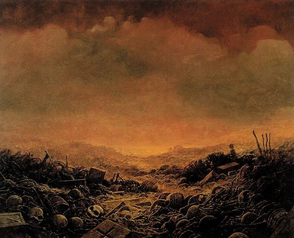 Curator: The canvas before us is entitled "L’incendie," or "The Fire," by Félix Ziem, created sometime in the 19th century using oil and tempera paint. What is your initial reaction? Editor: It’s bleak. There's a visceral sense of destruction, isn’t there? It feels as if Ziem captured more than just a fire; it's almost like he caught a societal collapse. Curator: Notice how the composition directs our gaze to the fiery glow dominating the horizon, a potent symbol perhaps of both destruction and purification, elements often intertwined in collective memory surrounding historical conflicts. What echoes do you perceive in this conflagration? Editor: This fiery vista certainly brings to mind how destructive events like war, famine, and even societal oppression often impact the marginalized most severely. The way that fire indiscriminately destroys everything is so analogous to the systemic violence unleashed during the Industrial Revolution, colonialism… Curator: You read violence and marginalization into the imagery? Editor: It’s unavoidable for me. That darkness, those charred earth tones—they signify devastation. Curator: The impasto technique adds another layer of meaning; the thickly applied paint gives texture and a tangible form to the chaos of the scene. The visual becomes tactile. Editor: Absolutely, and this physicality pulls me back to earth, the brutal reality for populations subjected to upheaval. What rituals of healing and reclamation would be necessary after this symbolic apocalypse? Curator: I agree that there’s a deep, almost primal intensity in this landscape. Ziem, often classified under Romanticism, surely was invoking both awe and terror, emotions frequently tied to the sublime. Editor: Precisely! The power dynamics embedded in a landscape painting are key here. It evokes themes that linger, challenging us to ask who has been sacrificed in order to consolidate political control. It burns those romantic myths. Curator: Perhaps a more ambiguous image than it first appeared to be. Editor: It resonates as a powerful meditation on enduring social tensions.
