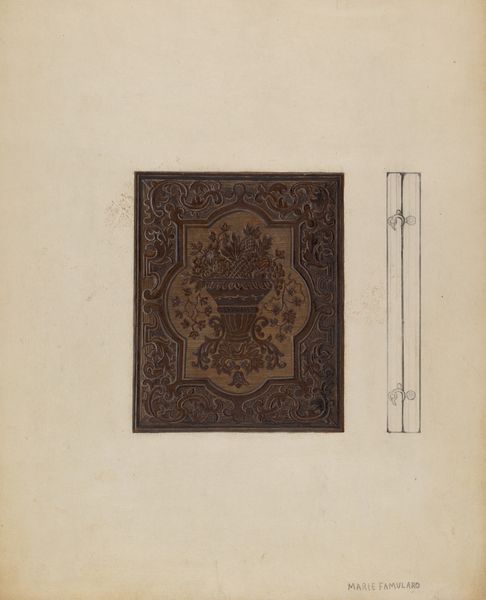 Curator: Before us, we have David P. Willoughby’s study of a “Brooch,” created around 1937, rendered in watercolor and charcoal. My first impression is a curious one—there’s a sort of meticulous delicacy to it, presented in triplicate. Editor: Triplication certainly emphasizes its art deco stylings; though the cool presentation hints at the mechanization encroaching into jewellery. One could compare this precise watercolor illustration to, say, product design blueprints from the same era, with the goal of mass reproduction and affordability, but rooted in historic aesthetics. Curator: Precisely! The piece captures this tension of tradition being subtly encroached upon by industry. Note how Willoughby provides not just the face, but also the side profile and back view, revealing the functional pin mechanism. It's an analytical perspective. Each angle tells its story; consider how it would actually be worn in society. Editor: You read a sense of encroachment from the views, I agree. I find the tonal balance here especially compelling. The dark frame is an intense constrast against the ornate cameo inside. Its composition feels incredibly poised, almost like a symbolic power play between modernity and timeless adornment, using dark framing and rich hues to establish dominance. Curator: It makes me wonder what the commission for the artist was like at the time. Was this made for promotional purposes? The way this rendering of light gives form to its objecthood. Its surface shines as a way to represent its luxurious texture. The cameo depicted is itself an old form in need of continuous rejuvenation. It has this tension between progress and preservation. Editor: Absolutely, one can’t help but wonder about its original intention within wider visual culture; the artist so elegantly manages to draw us into contemplation. Curator: True; Willoughby encourages us to explore jewelry as artifice, as well as societal value. It almost encourages questions about ourselves. Editor: I find it intriguing, that the decorative style persists still and has meaning; Willoughby truly encapsulates that complexity.