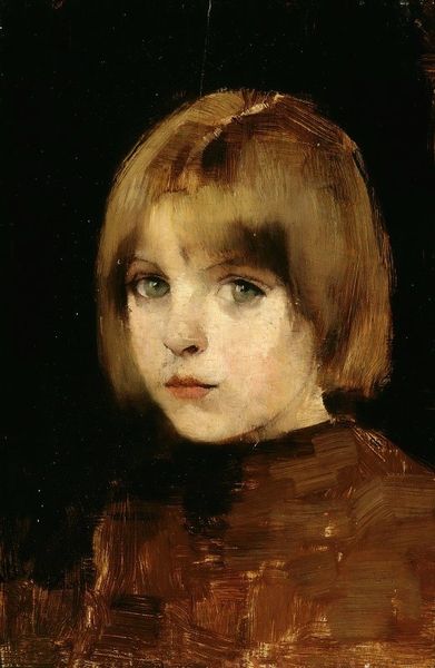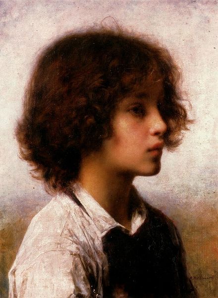Curator: We're looking at "Studienkopf," a work rendered in oil paint by Gabriel von Max. There's no exact date attributed to it, so its precise moment of creation remains somewhat of a mystery. Editor: My first thought is of vulnerability. There's something so innocent in her upward gaze, almost as if she's seeking answers or solace beyond the frame. The soft lighting enhances that feeling. Curator: It’s intriguing how the academic style of portraiture elevates the sitter while maintaining this study-like feel. Von Max seemed focused on the application of paint itself, especially in the rendering of the hair. You can really see the brushstrokes at play. Editor: Absolutely. Considering the lack of specific details—we don't know her name or context—she almost becomes an archetype, embodying youth and perhaps the naive hope of a specific social class, if we examine who could afford to have their portrait made in this manner. Curator: Her clothes appear relatively plain, a stark contrast to the detailed rendering of her face and hair, directing our attention there. The artist’s process here underscores the skill required to achieve such realism. It invites examination of academic portraiture as an economic and artistic pursuit. Editor: And perhaps a consideration of societal expectations placed upon young women at the time. That upward gaze can be interpreted as aspiration, but also resignation. It is always fascinating to consider what these artworks represent about gendered and racial politics of its time. Curator: I agree. Looking at it from the perspective of labour, the work obviously displays artistic skills but also the commissioning, framing, displaying... all aspects embedded in a material exchange. Editor: Reflecting on the image's title "Studienkopf," it invites a sense of continuous learning and development and underscores the dynamic relationship between the painting and the people whose gaze and theories give it new meanings. Curator: Absolutely, these paintings often are multifaceted and tell us so much about art-making. Editor: It is always worth pausing and interrogating these representations. What do we see? And more importantly, what do we bring to it?