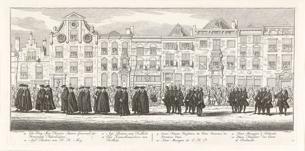 Curator: Looking at this detailed engraving, "Begrafenis van Johannes Rannink, 1747," by Jan Gerritsz. Visser, done in 1787, one can observe the historical customs through which eighteenth century Amsterdam publicly mourned. The artwork shows the funeral procession making its way from Oosterkerk to his final burial site. Editor: Well, my first impression is…dense. Just a sea of hats and dark clothing. The clouds swirling above seem to echo the somber mood below, and the overall impression is of a rather severe, formal event. I'm not really picking up on the supposed Baroque flair. Is it just the subject matter weighing everything down? Curator: The "Baroque" and "Realism" style categorizations provide a helpful context here. What catches my eye is the blend of meticulously rendered details like the buildings and the textures, with a somewhat idealized sense of grandeur, perhaps suggesting the Baroque. This historical event is being depicted not just as a city scene, but almost as a civic ceremony. Editor: Right, there’s a definite sense of ordered grief here. Knowing this was a public affair changes my view. The image appears almost as propaganda in favor of unity! Considering how important image making was during that period of Amsterdam’s political and social change, it's less about pure Baroque exuberance and more about communicating a specific social message, through clear visuals aimed at popular consumption. It also says that Rannik was killed in May but only laid to rest in December! What kind of waiting period was this? Curator: Yes, I noticed that as well, and that detail provides such a profound socio-political lens for the context surrounding this funeral procession! Johannes Rannink may have represented more than simply an individual and his delayed funeral more than mere mourning. What an insightful depiction! I am leaving with an awareness of my personal views on historical realism versus emotional contextualization. Editor: Exactly. What an unexpectedly loaded image; so much revealed in a relatively small print. I appreciate how it sparked conversations about politics, personal reflection, and community, all under a veil of eighteenth-century decorum.