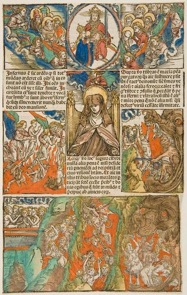 Curator: Before us is Jean Chappuis’s "The Last Judgment from Les Sept Articles de la Foi," dating back to around 1470. The piece is currently housed at the Art Institute of Chicago and employs tempera, watercolor and drawing techniques in its construction. Editor: It strikes me as an anxious vision, even considering the subject. The relatively pale palette combined with the sheer number of figures creates an effect that’s less grand spectacle and more claustrophobic reckoning. Curator: The choice of such pallid tones resonates with the theme. These aren’t robust, celebratory colors; rather, they evoke the ethereal, liminal space between life and death, between judgment and eternal fate. Look closely at Christ. He is framed within luminous halos, but His humanity is visible; he is fragile and empathetic to our fears. Editor: You're right; it is a decidedly humanized depiction of the divine. Note the careful organization within the apparent chaos. Chappuis uses distinct zones – the heavenly host, the blessed, the damned – each rendered with varying degrees of detail and saturation, creating a hierarchy within the composition. The negative space in the artwork's illuminated lettering on the page, is very much related. Curator: Precisely. And the narrative unfolding around the figure of Christ is steeped in symbolic language: Angels brandishing swords, a river of fire, supplicating souls ascending and falling. Each element represents aspects of divine judgment. In many cultures, light, like what emanates from the figure of Christ in the art piece, is perceived as the supreme good that allows one to be moral, rational, wise, and capable of judgment. But we shouldn't forget the "seven articles of faith." It highlights a focus on doctrine within personal salvation. Editor: That's insightful. Reflecting on our discussion, I appreciate how Chappuis uses both color and composition to express deep-seated cultural anxieties about faith and judgment. Curator: And I am reminded of the power of visual language to express the inexpressible—the profound mystery of salvation.